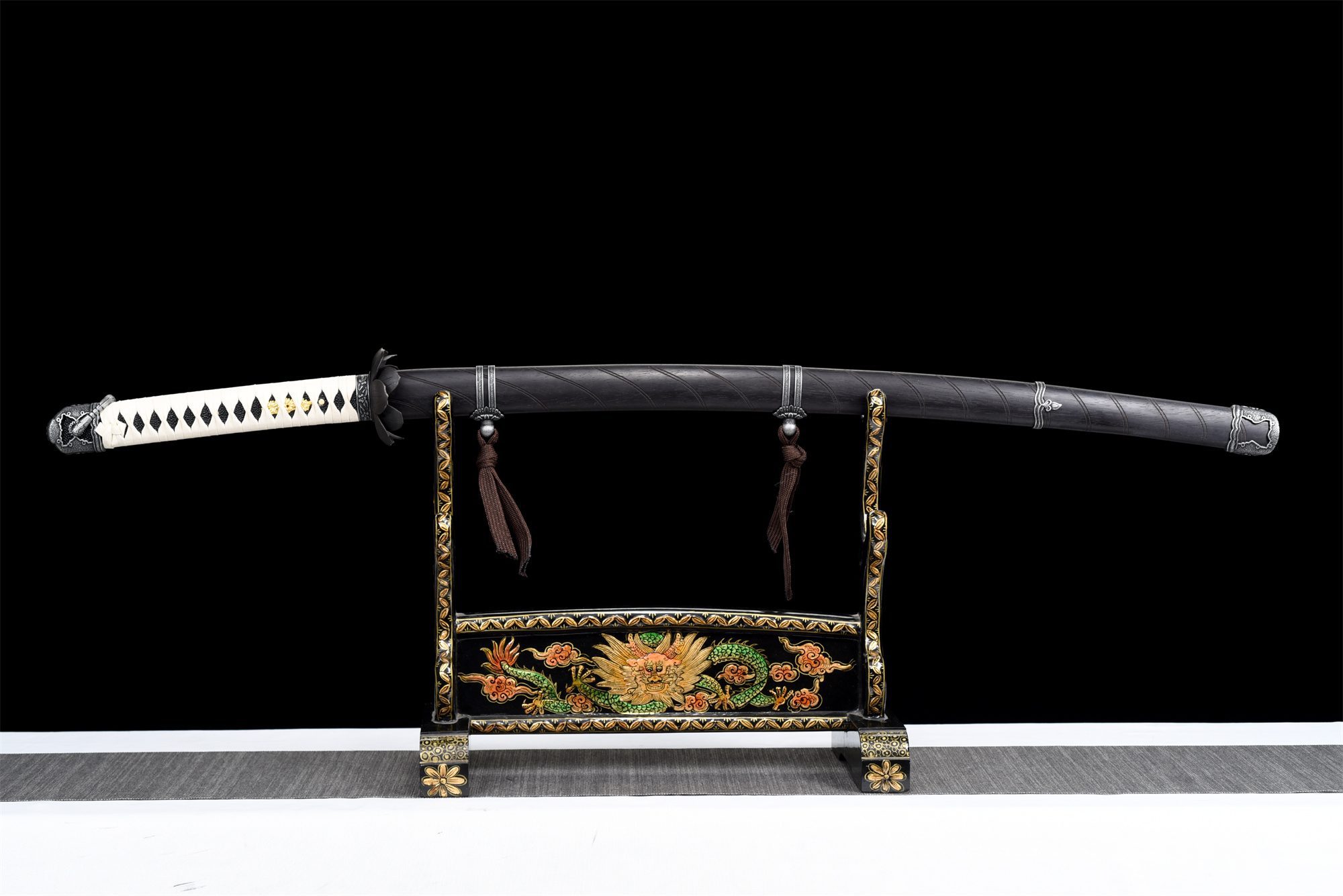 La lama in acciaio al manganese rivela misteriosi riflessi blu che danzano sulla sua superficie, che ricordano la magia oscura che Genichiro canalizza nelle sue tecniche di combattimento. La tsuba in lega nera presenta un fiore di loto in rilievo, simbolo di rinascita e purezza che emerge da acque turbolente, una metafora perfetta del tragico destino del personaggio. L’impugnatura combina armoniosamente finta pelle di razza nera e palissandro, mentre l’intreccio bianco a rombi dello tsuka-ito contrasta elegantemente con i toni scuri. I menuki dorati presentano un drago, una creatura mitica associata al potere e alla trasformazione. Il fodero in palissandro è adornato da un koiguchi in argento circondato da metallo e da un kojiri in argento decorato, mentre le impugnature ad anello in metallo evocano l’aspetto militare del personaggio.