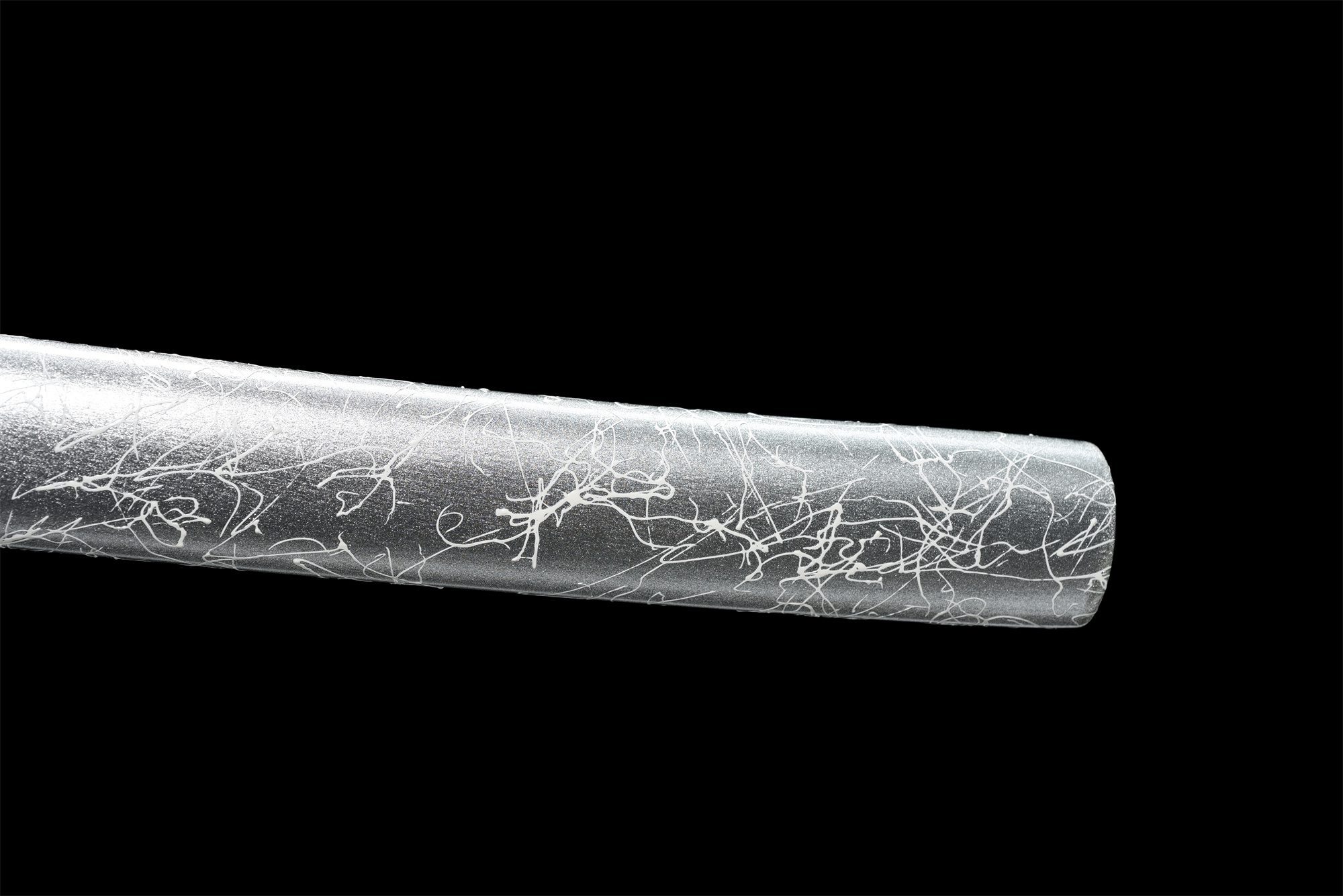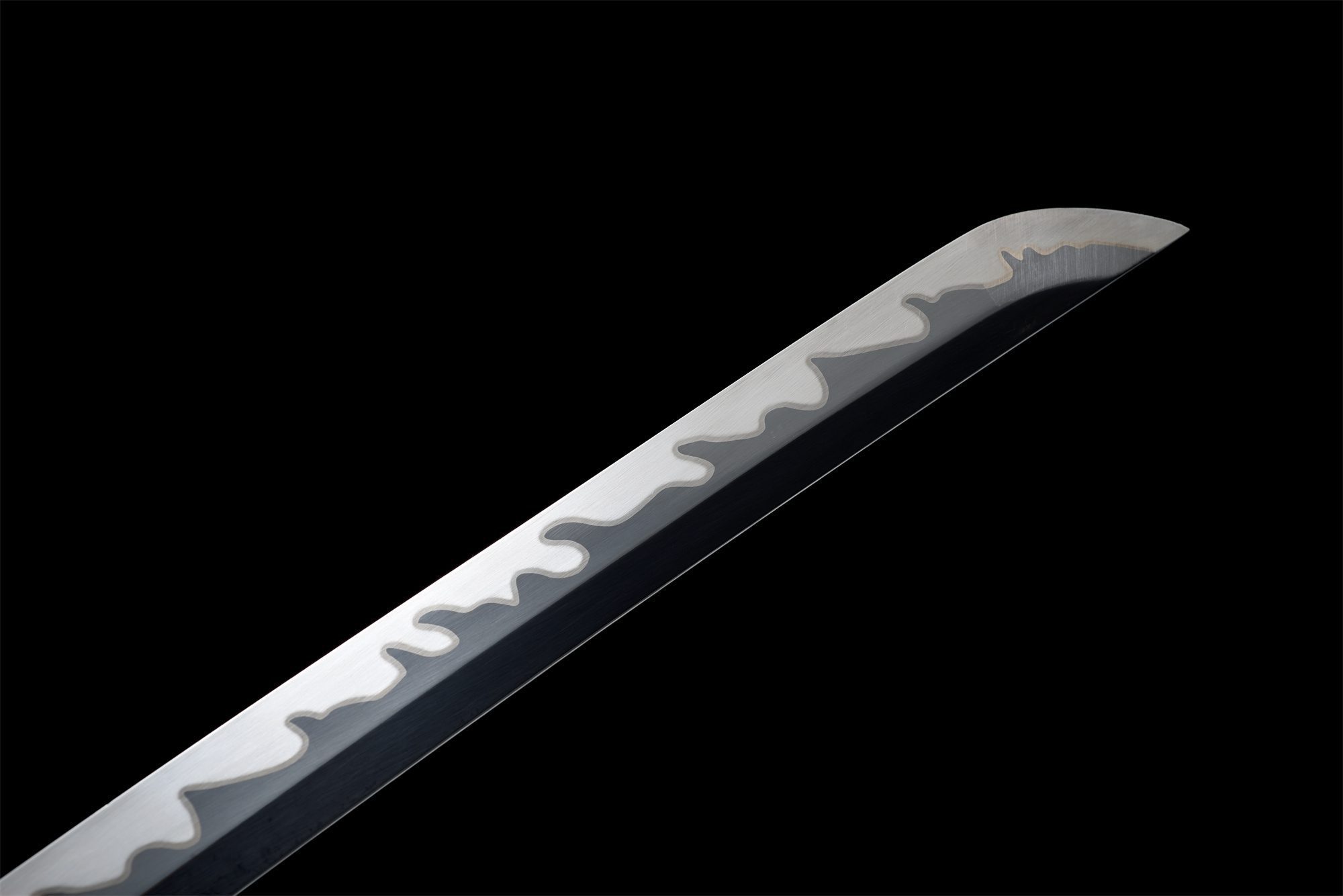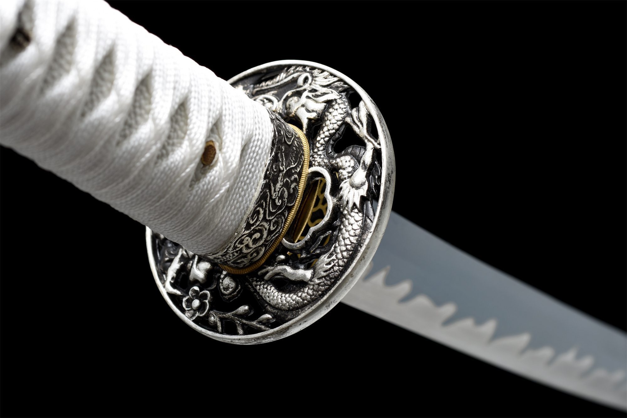 La sua lama in acciaio al manganese presenta una finitura grigliata nera che contrasta magnificamente con il hamon visibile lungo il bordo. Questa tecnica di tempra differenziale crea un effetto visivo sorprendente, migliorando al contempo le proprietà di taglio. La tsuba arrotondata presenta un drago inciso in nero e argento, simbolo di potere e saggezza nella tradizione giapponese. L’impugnatura combina armoniosamente legno massello e finta pelle di razza bianca, mentre l’intreccio bianco (tsuka-ito) forma motivi a rombi che garantiscono una presa salda ed elegante. I menuki rappresentano draghi neri, che richiamano il potere mistico di queste creature leggendarie. La saya in legno massello laccato grigio è adornata da raffinati dettagli bianchi, completati da un sageo bianco che sottolinea la coerenza estetica dell’insieme.