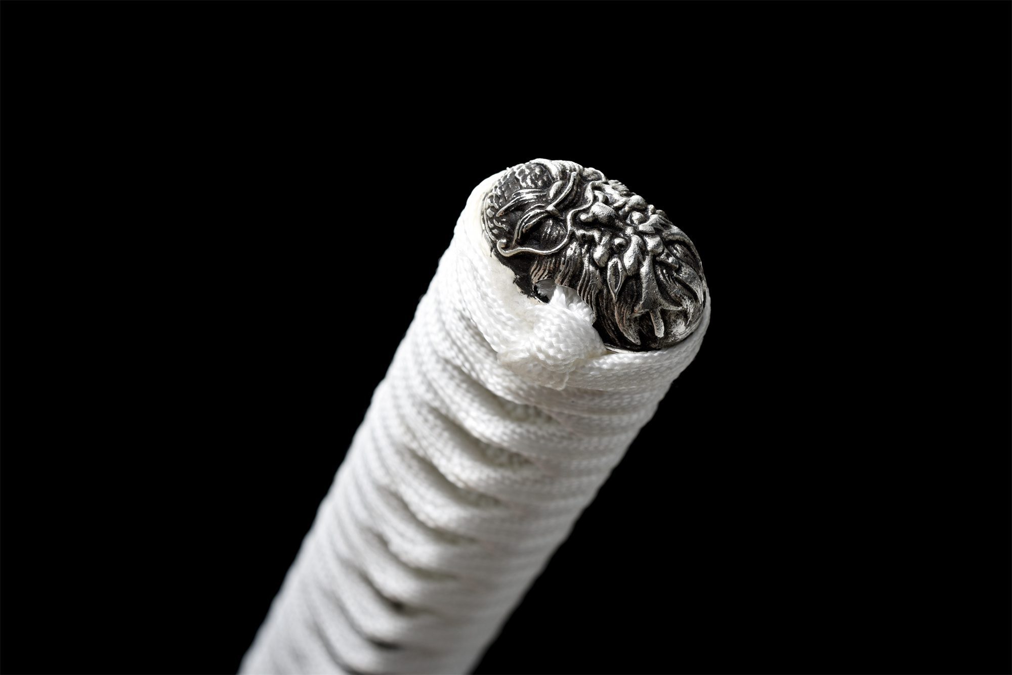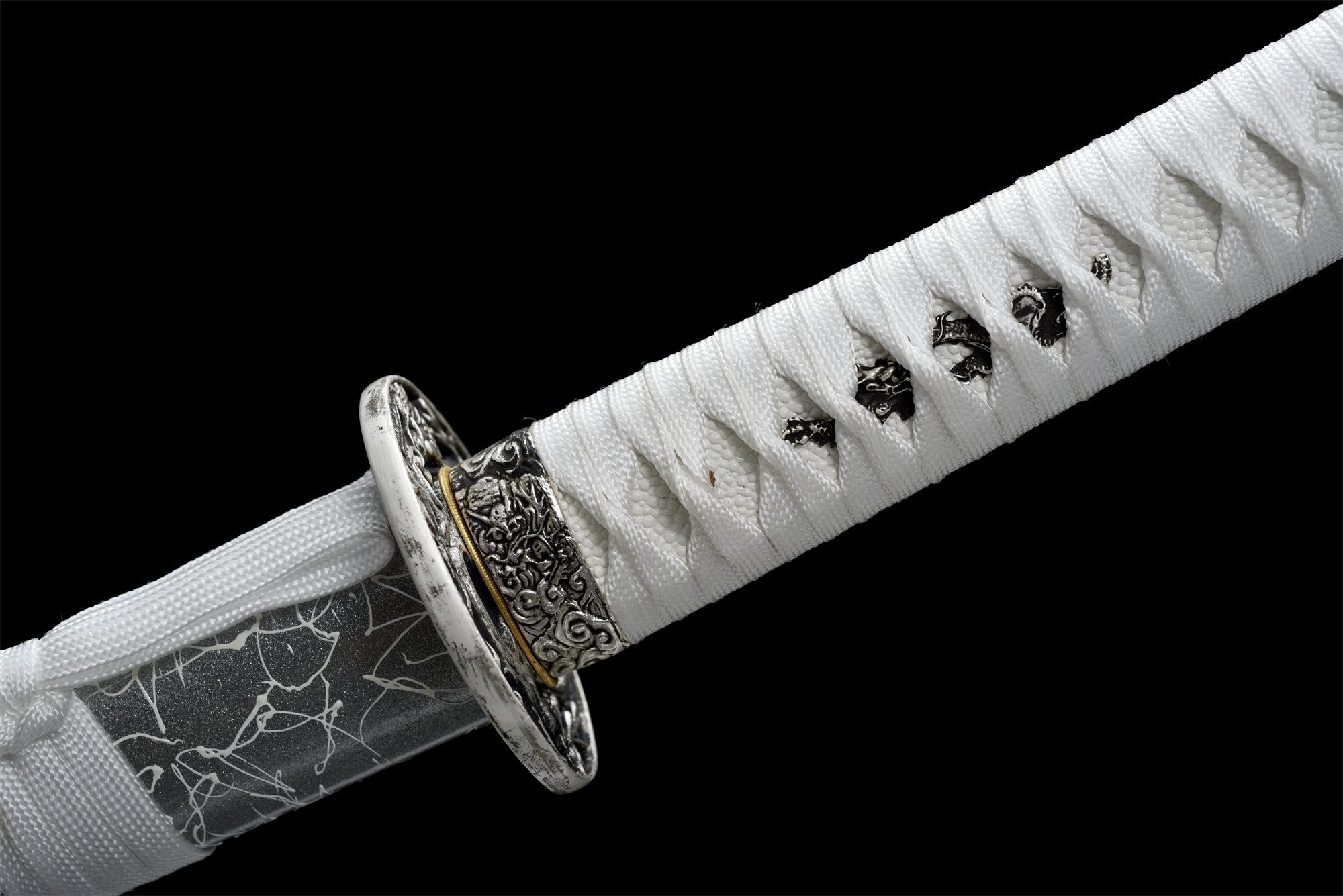 - Tsuka-ITO (柄糸): intrecciato bianco sopra l’impugnatura con motivi a rombi.