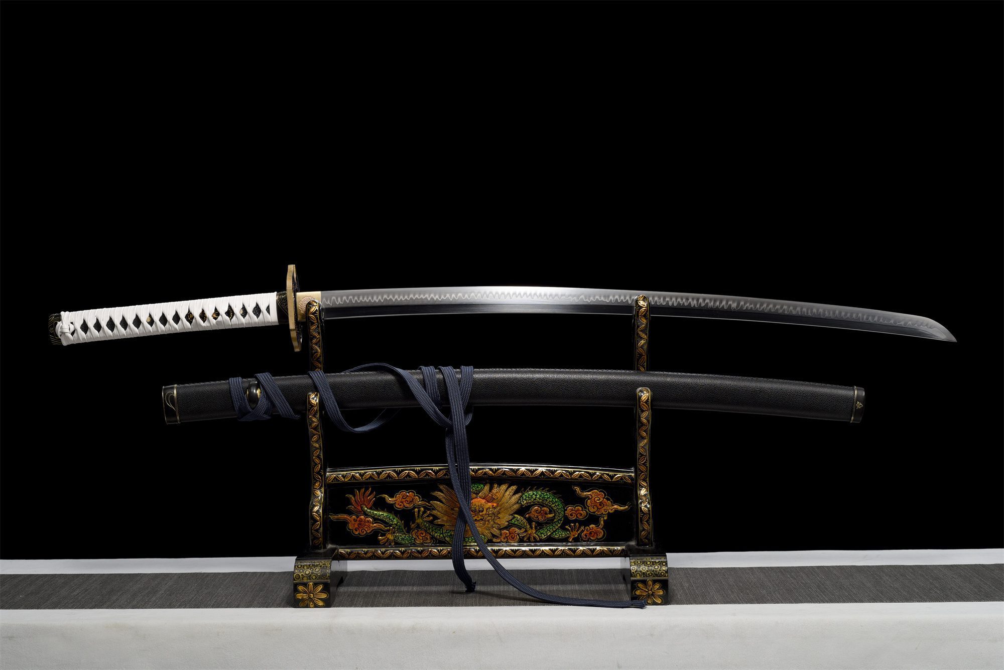 La lama in acciaio T10 ad alto tenore di carbonio rivela un autentico gunome midare hamon, risultato della tradizionale tempra differenziale che crea naturali ondulazioni lungo il filo della lama. Questa antica tecnica conferisce alla lama una resistenza eccezionale, creando al contempo motivi unici che catturano lo sguardo. La tsuba blu a forma di farfalla, impreziosita da contorni e incisioni dorati, simboleggia la trasformazione e la rinascita. L’impugnatura presenta una struttura sofisticata con una base in finta pelle di razza nera ricoperta da una treccia in finta pelle bianca che forma perfetti rombi geometrici. I menuki dorati aggiungono accenti preziosi, mentre il fuchi e il kashira in lega nera e dorata completano armoniosamente l’insieme. Il fodero in vero legno, rivestito in autentica pelle nera, è decorato con elementi ornamentali in lega nera e dorata, creando una continuità visiva con il sageo blu, che aggiunge un sottile tocco di colore.