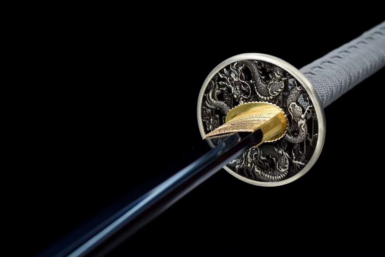 - Guardia (Tsuba 鍔): lega d’argento e nero con un drago avvolto attorno alla guardia.
