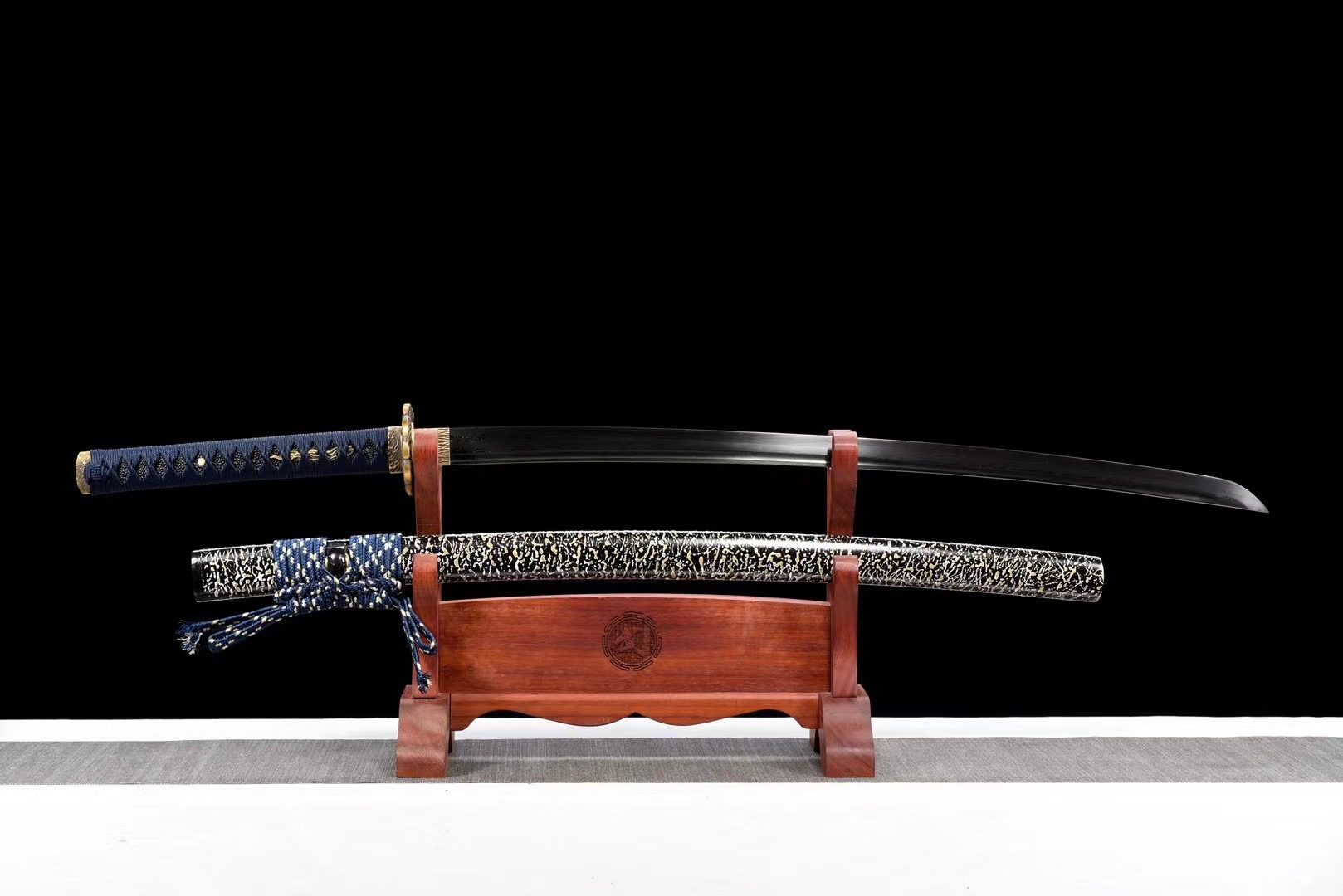 La sua lama in acciaio di Damasco rivela i suoi caratteristici motivi ondulati che ricordano le fiamme danzanti, mentre il bo-hi alleggerisce il design complessivo e produce un caratteristico sibilo quando viene mosso. La guardia circolare (tsuba) in lega d’oro presenta un drago arrotolato che si morde la coda, simbolo di eternità e ciclo perpetuo, splendidamente cesellato nel metallo prezioso. L’impugnatura (tsuka) combina la tradizionale imitazione della pelle di razza nera con una treccia blu a rombi (tsuka-ito) che garantisce una presa salda ed elegante. I menuki dorati rappresentano draghi in miniatura, mentre il fuchi e il kashira presentano motivi a forma di fiamma intagliati nella lega d’oro. Il fodero in legno laccato nero (saya) è decorato con delicati motivi bianchi, contrastati dalle estremità nere e completati da un sageo blu e bianco.