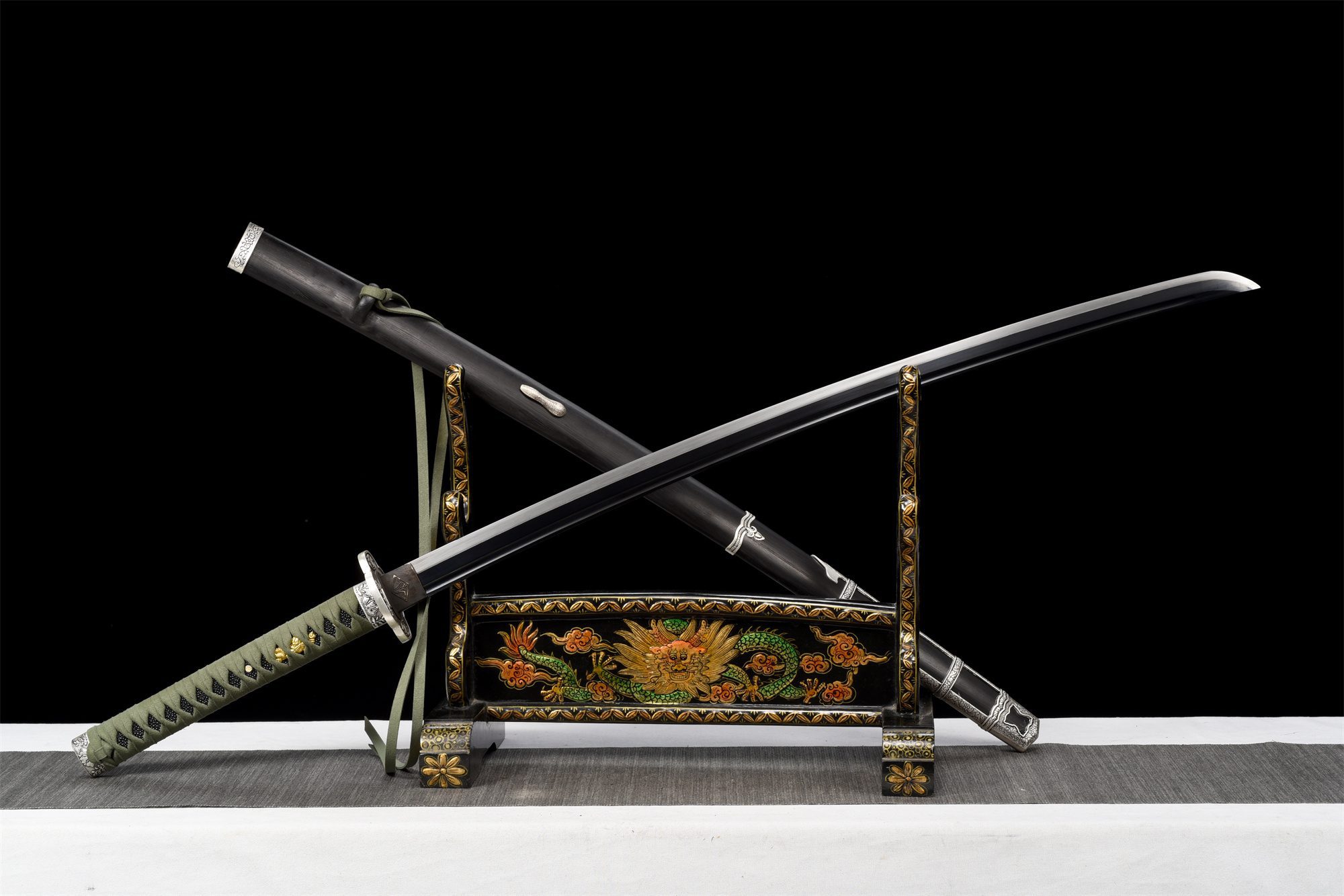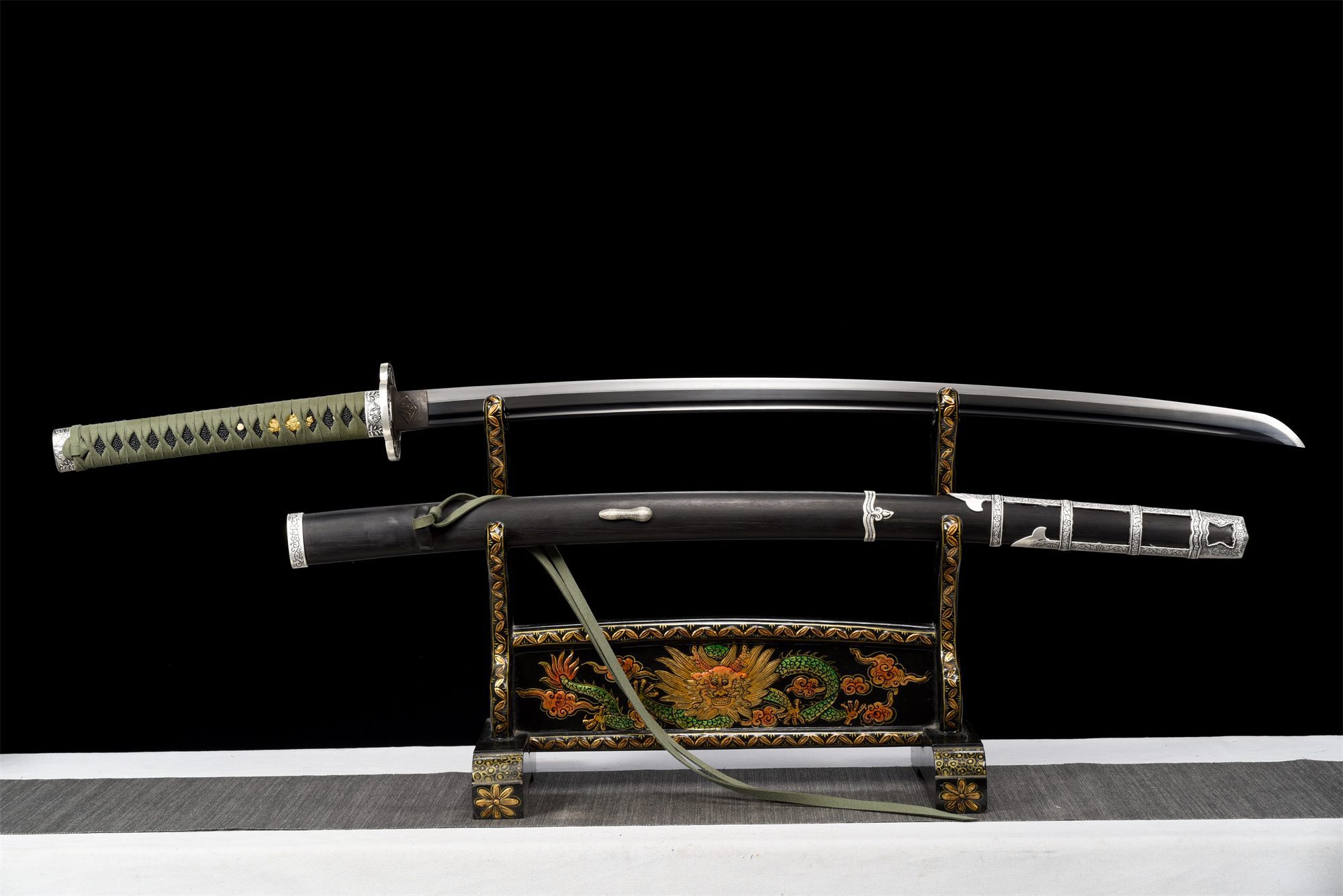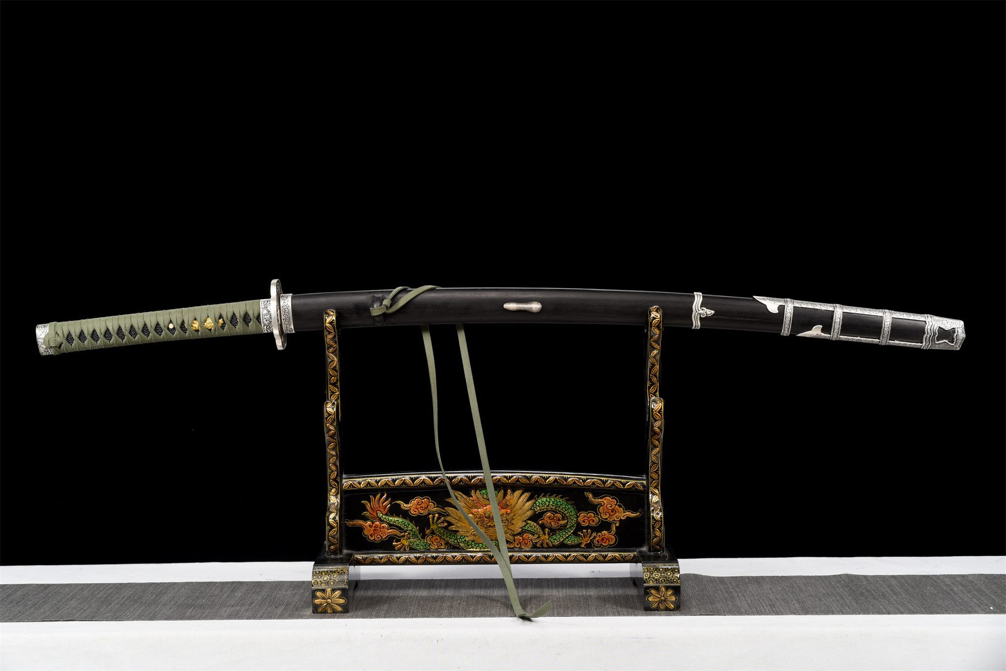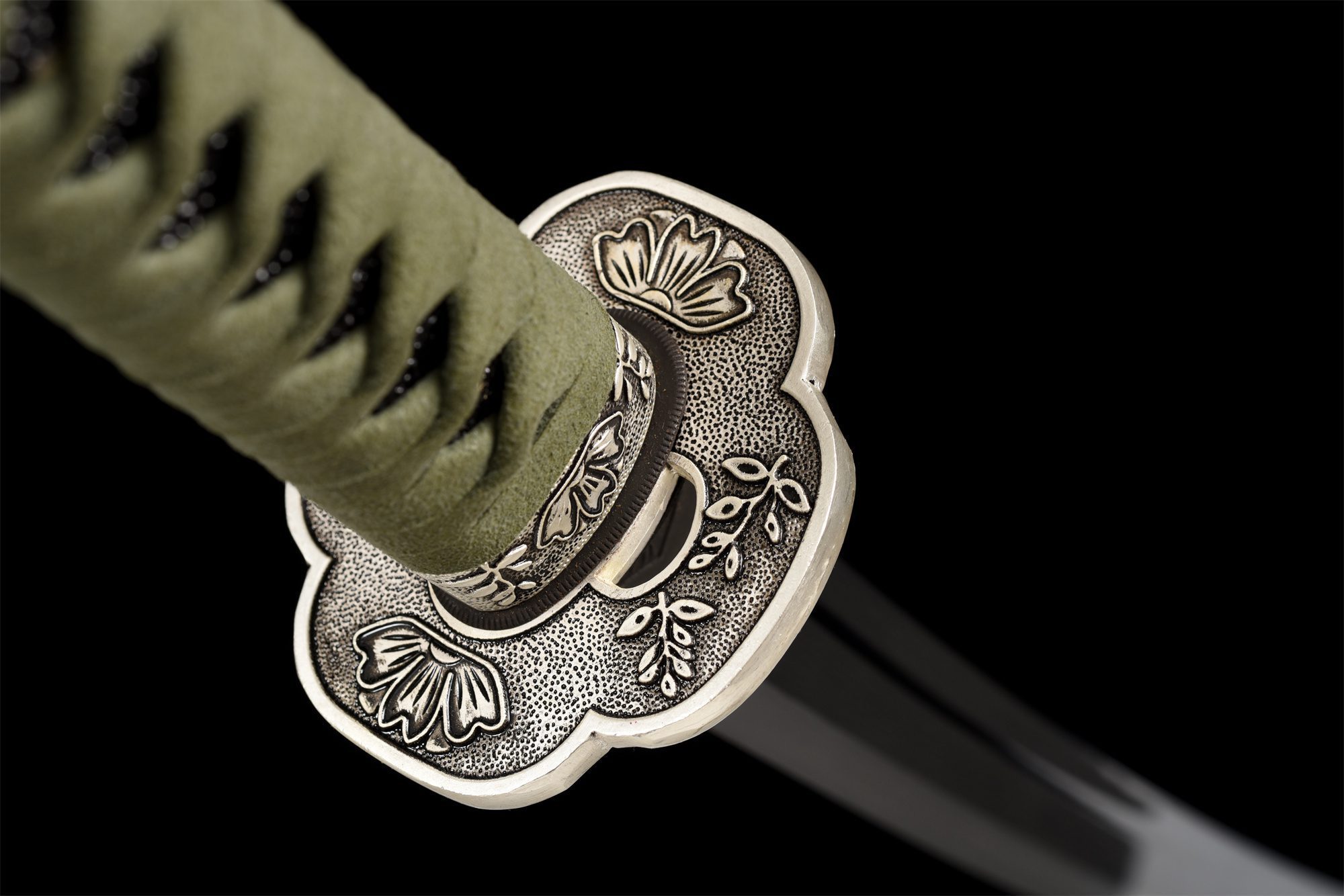 La sua lama in acciaio al manganese presenta una sorprendente finitura nera, esaltata da un autentico hamon diritto ottenuto attraverso una tempra differenziale, che traccia una linea netta tra il filo temprato e il dorso più flessibile. Il bo-hi intagliato nel metallo alleggerisce la lama e produce il famoso “canto della katana” durante i movimenti. La tsuba arrotondata a forma di croce, realizzata in lega d’argento, presenta delicate incisioni floreali che si ripetono armoniosamente sul fuchi e sul kashira, creando una notevole coerenza decorativa. L’impugnatura rivela una meticolosa maestria artigianale con la sua base in finta pelle di razza nera ricoperta da tsuka-ito verde intrecciato a rombi, mentre i menuki dorati raffiguranti draghi aggiungono un tocco di nobiltà. Il fodero in palissandro, con le estremità placcate in argento incise con motivi floreali identici a quelli sulla guardia, completa questa armonia e presenta un anello verde abbinato all’intreccio.