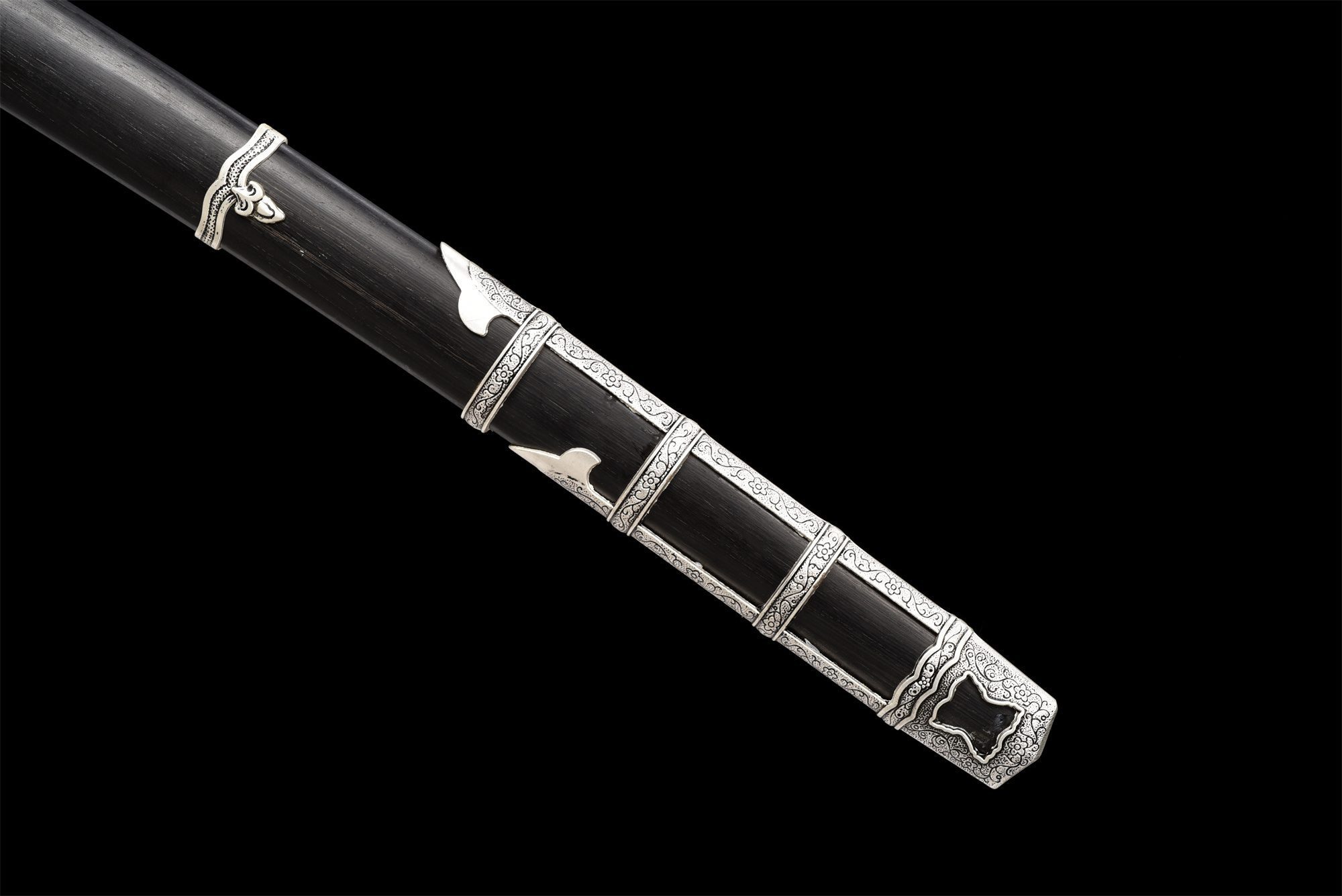 - Fodero (Saya 鞘): palissandro con estremità placcate in argento incise con motivi floreali.