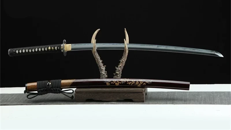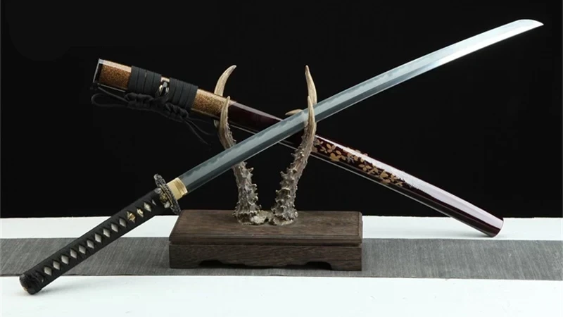 La spada katana Jinsei (人生), nota anche come Vita, ha una lama in acciaio T10, rinomato per la sua resistenza e durezza, impreziosita da un hamon midare ottenuto dalla tempra differenziale dell’argilla. Il fodero bordeaux e marrone sabbia presenta fiori di conchiglia intagliati a mano. Il manico è realizzato in vera pelle di razza bianca, con intreccio di rombi neri per una presa ottimale. Il menuki placcato oro, così come la guardia, il fuchi e il kashira placcati oro e argento, riccamente incisi con motivi floreali, conferiscono a questa katana una raffinatezza unica. L’habaki in ottone liscio completa questo insieme armonioso. Il nome Jinsei, che significa “Vita”, riflette la profondità e la bellezza di quest’opera, invitando il suo possessore a un profondo legame con la cultura giapponese e l’arte della katana.