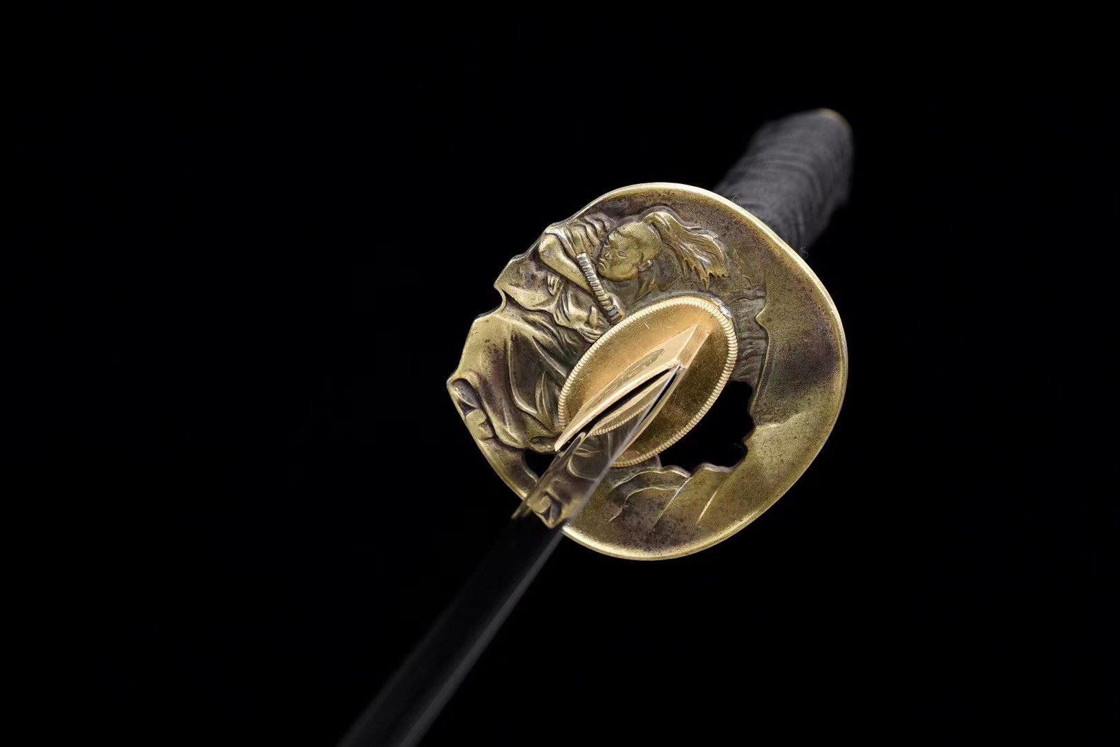 - Guardia (Tsuba 鍔): splendida guardia in ottone intagliato raffigurante un samurai su un lato e un teschio sull’altro.