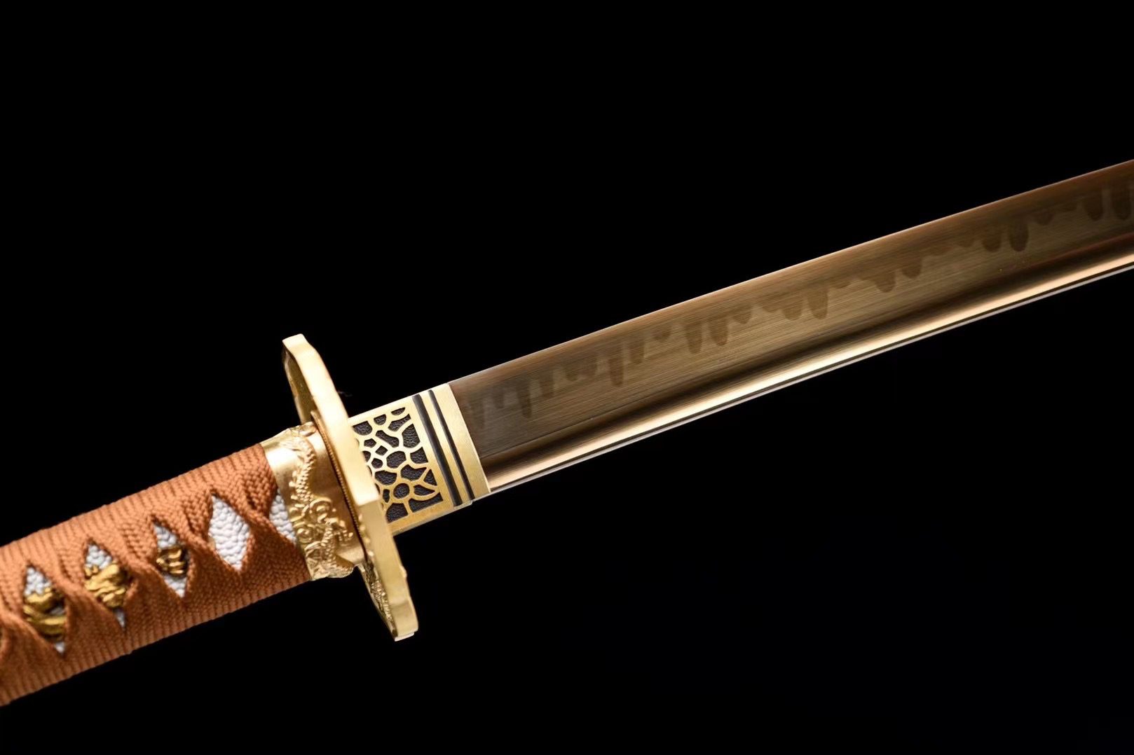 La lama in acciaio T10 della spada katana Kōkiba presenta un’eccezionale tonalità ramata che cattura e riflette la luce con intensità ipnotica. L’autentico hamon, ottenuto attraverso una tempra differenziale, forma una linea ondulata che separa aree di diversa durezza, creando un suggestivo contrasto visivo su questa superficie dorata. Il bo-hi incava elegantemente il dorso della lama, alleggerendone la struttura e producendo quel caratteristico suono sibilante quando viene mossa. La guardia in lega dorata (tsuba) presenta un drago, un motivo che si ripete armoniosamente sul fuchi, mentre il kashira corona l’impugnatura con una maestosa testa di drago. L’impugnatura rivela l’autentica trama della pelle di razza bianca (samegawa) sotto l’intreccio marrone a forma di diamante, punteggiato da menuki dorati che rappresentano draghi. Il fodero sorprende con la sua finitura trasparente che rivela la bellezza naturale del legno grezzo, incorniciato da estremità nere a contrasto e da un sageo bicolore nero e rame.