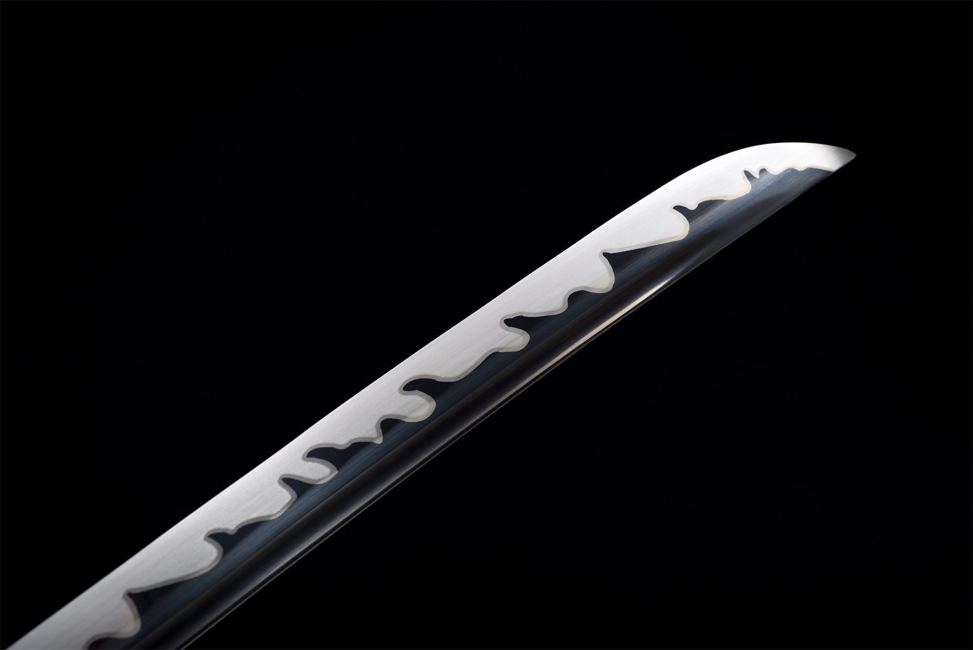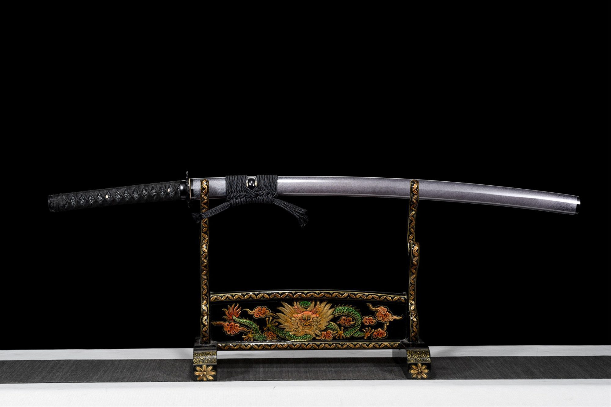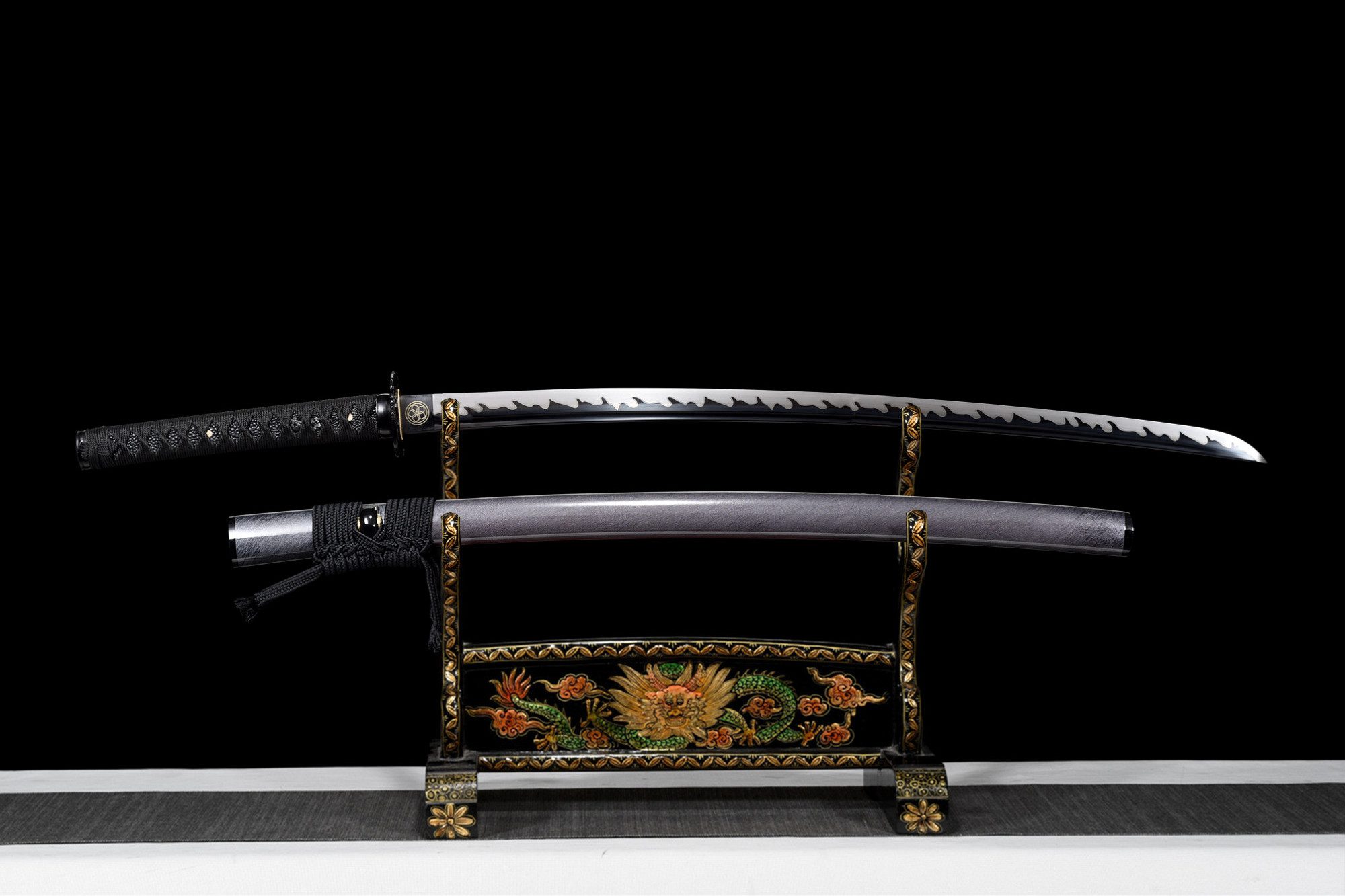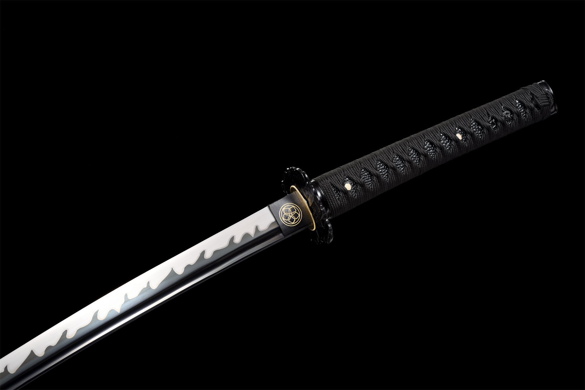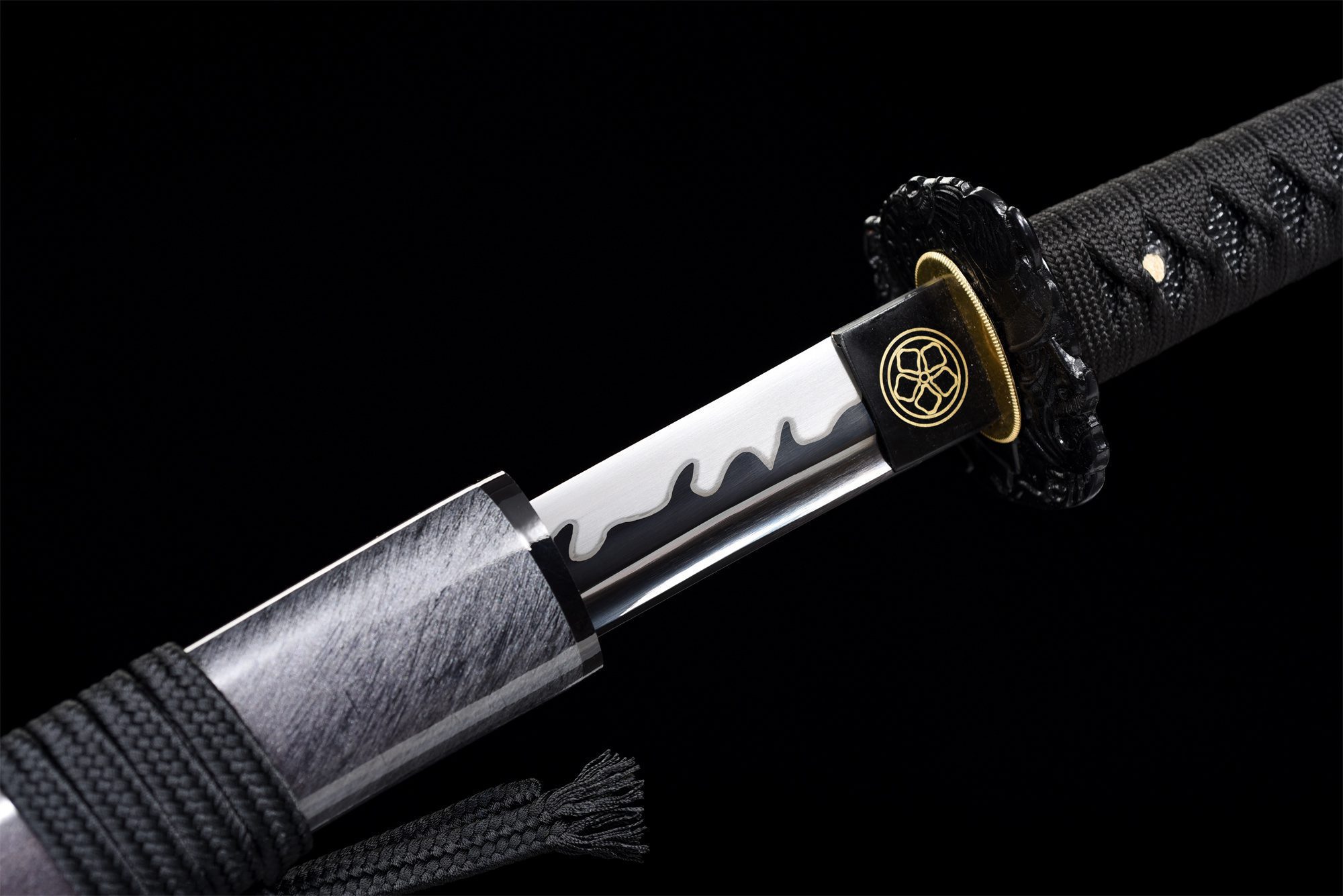La sua lama in acciaio al manganese presenta una sorprendente finitura bicolore in cui il bianco perlaceo si fonde delicatamente con il nero intenso, creando un effetto visivo accattivante esaltato dall’hamon midare gunome che ondeggia lungo il bordo. Il bo-hi intagliato nella lama alleggerisce il design complessivo e produce un caratteristico sibilo durante il movimento. La tsuba rotonda in lega nera presenta delicate incisioni che completano l’estetica monocromatica, mentre il fuchi e il kashira in lega nera liscia incorniciano elegantemente l’impugnatura. La tsuka combina finta pelle di razza nera con intrecci tsuka-ito neri a forma di rombo, adornati con menuki che rappresentano draghi neri, simboli di potere. La saya in legno laccato bianco e nero con effetto spazzolato offre un contrasto sorprendente, con le estremità nere (kojiri e koiguchi) che unificano il tutto, completato da un tradizionale sageo nero.