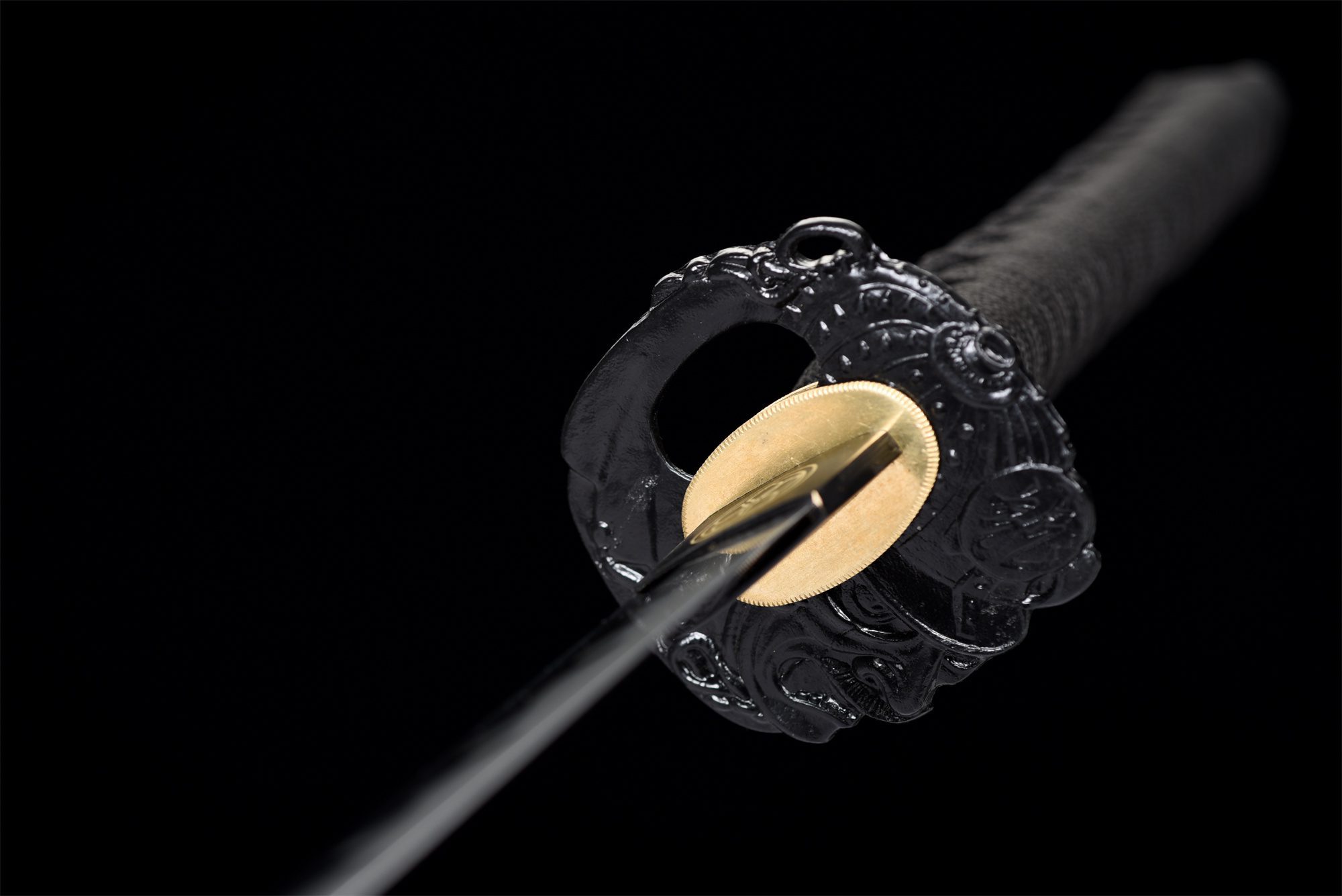 - Guardia (Tsuba 鍔): Guardia rotonda in lega nera incisa.