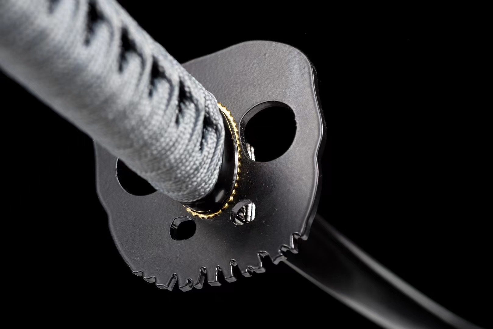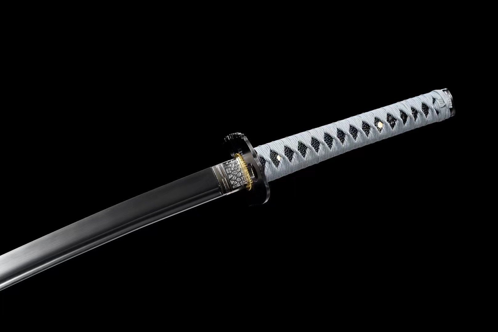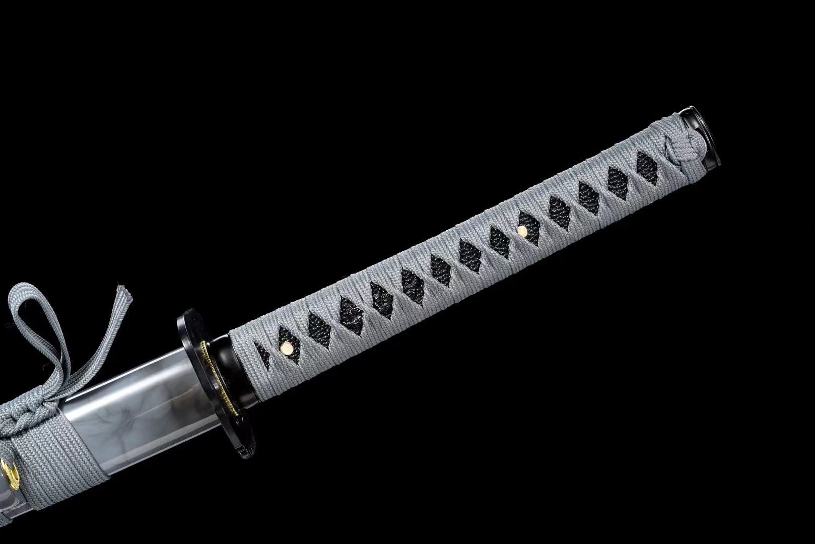 - Tsuka-ITO (柄糸): grigio intrecciato sopra l’impugnatura con motivi a rombi.
