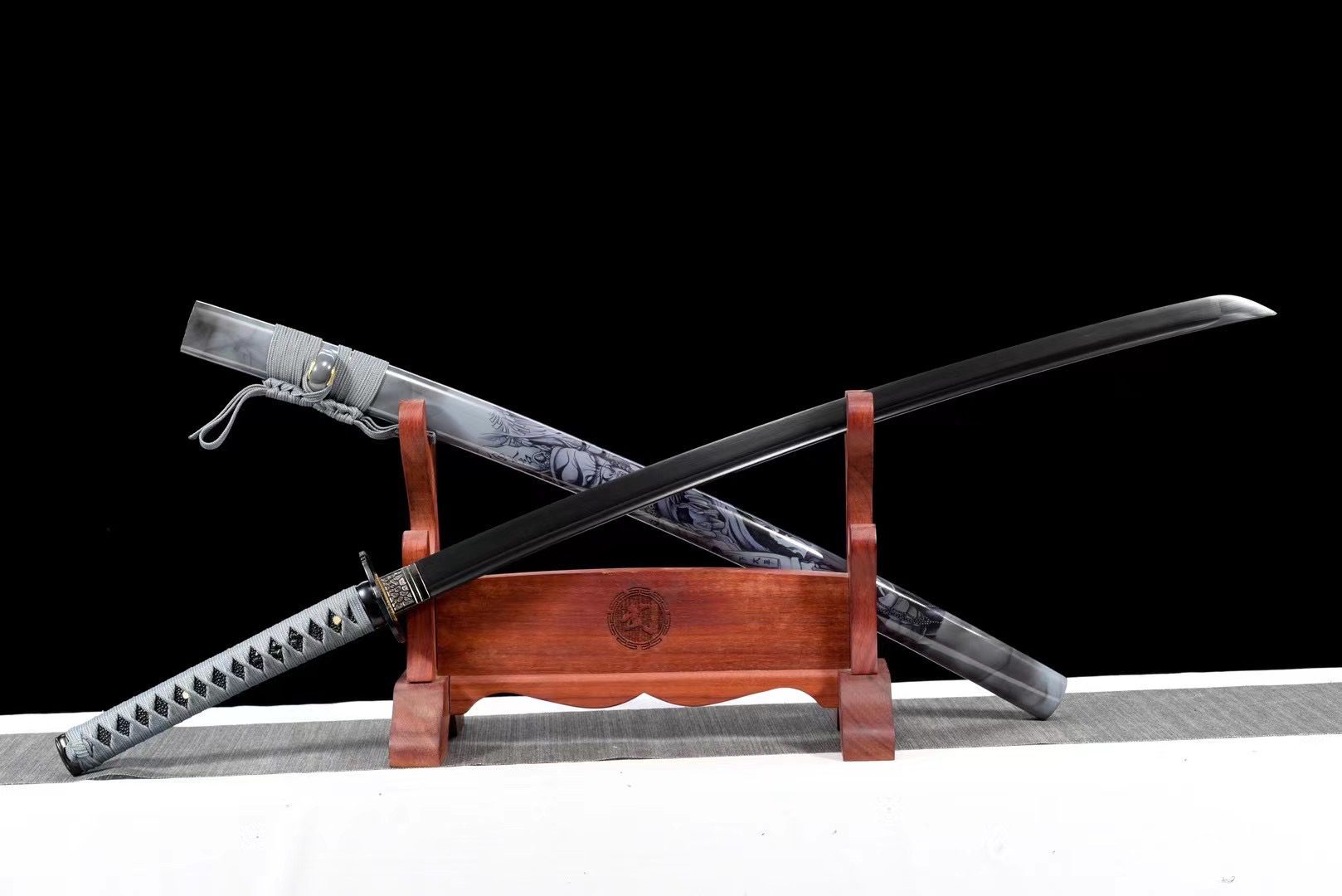La lama in acciaio T10 è caratterizzata da un rivestimento nero intenso che assorbe la luce e conferisce all’intero pezzo una presenza imponente. La tsuba a forma di teschio con bordi seghettati evoca la mortalità e la trasformazione, mentre la sua lega resistente garantisce una protezione efficace. L’impugnatura combina armoniosamente la finta pelle di razza nera con il legno, creando una presa salda e confortevole. L’intreccio grigio (tsuka-ito) forma motivi a rombi che si intrecciano elegantemente, mentre i menuki rappresentano un drago nero, simbolo di potere mistico. Il fuchi e il kashira in lega nera liscia completano questa estetica oscura, contrastando sottilmente con l’habaki argentato. Il fodero in legno laccato grigio è decorato con demoni dipinti che rafforzano l’atmosfera misteriosa di questo pezzo, accompagnato da un sageo grigio abbinato.