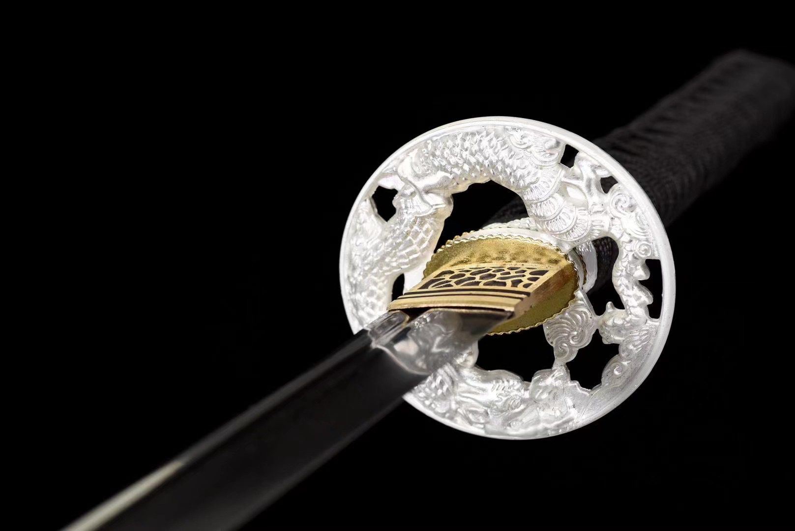 - Guardia (Tsuba 鍔): rotonda, placcata in argento, decorata con un drago inciso.