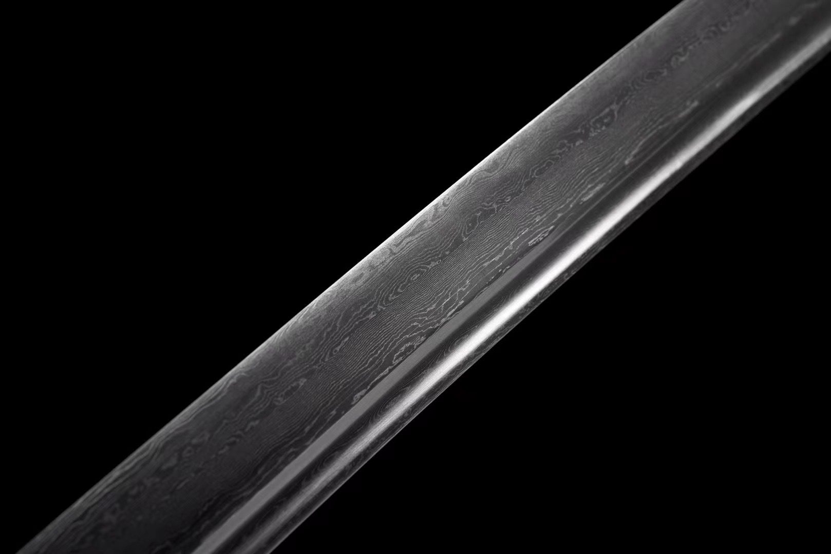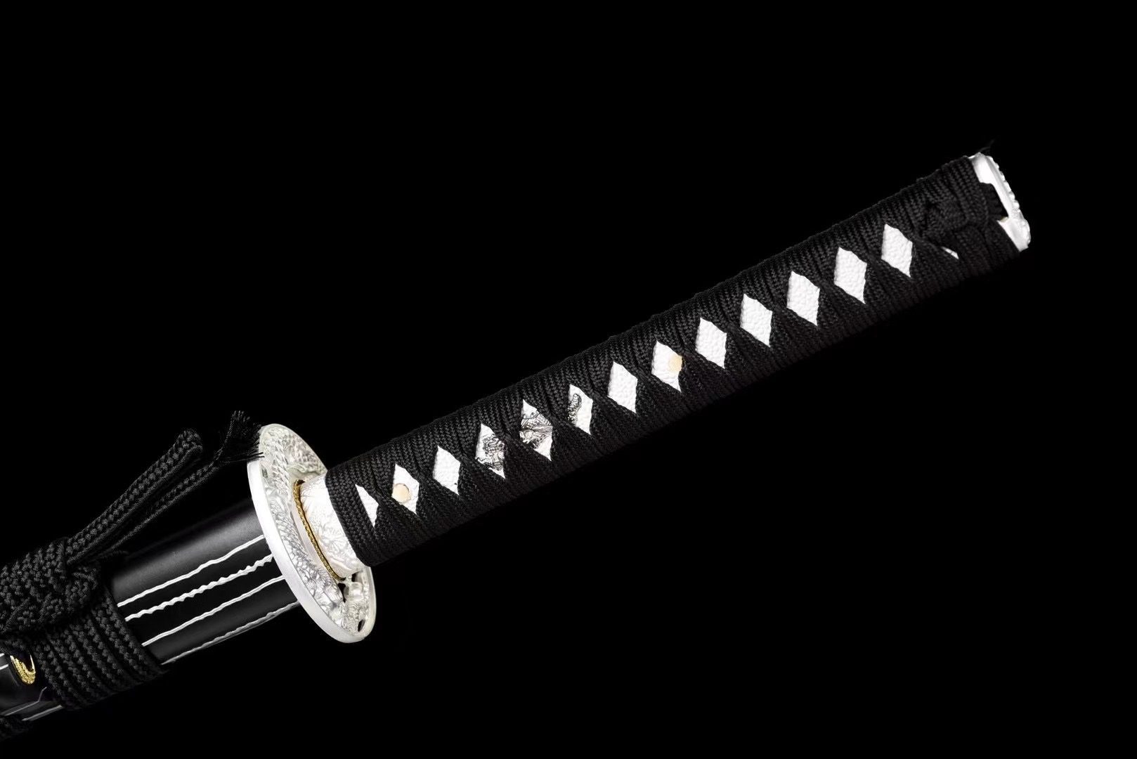 La lama in acciaio Damasco nero rivela motivi ondulati che ricordano i flussi di lava congelati nell’ossidiana. Il bo-hi scolpisce un’elegante scanalatura che alleggerisce la lama producendo un caratteristico sibilo quando viene mossa. La tsuba rotonda in lega d’argento contrasta magnificamente con la lama scura, mentre il drago inciso simboleggia la forza primordiale che giace dormiente nelle profondità vulcaniche. L’impugnatura presenta un autentico samegawa bianco ricoperto da una treccia nera a rombi, che crea un sorprendente equilibrio visivo. I menuki rappresentano draghi d’argento che sembrano emergere dalle profondità, mentre il fuchi e il kashira, adornati con fiori incisi, aggiungono un tocco di raffinatezza. Il fodero laccato di nero con strisce bianche evoca le striature naturali dell’ossidiana levigata, completato da un sageo nero che unifica il tutto.