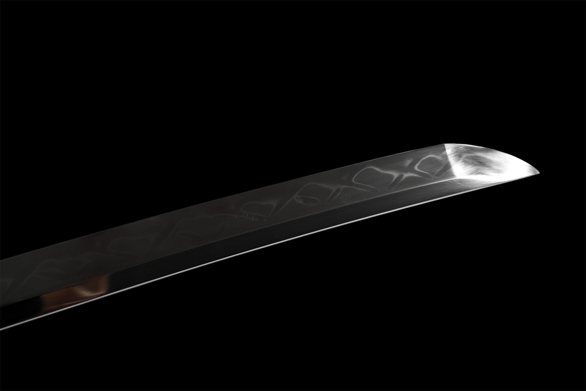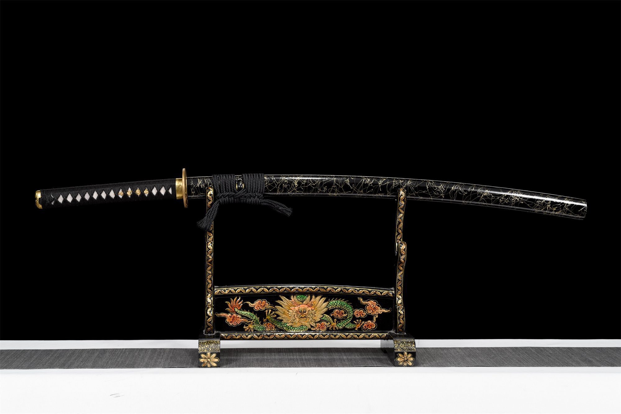La sua lama in acciaio T10 ha una superficie lucidata a specchio che rivela un autentico choji hamon con graziose ondulazioni, risultato di una tempra differenziale controllata. Questa linea di tempra serpeggiante è una testimonianza dell’antica maestria artigianale e conferisce a ogni katana una firma unica. La tsuba arrotondata in rame dorato presenta una martellatura e un’incisione meticolose, completate da un kozuka-hitsu che ne esalta la funzionalità. L’impugnatura combina autentica pelle di razza con intrecci neri a rombi, mentre i menuki presentano draghi dorati finemente cesellati. Il fuchi e il kashira in rame dorato si armonizzano perfettamente, quest’ultimo adornato con il tradizionale simbolo delle onde. Il fodero in legno laccato nero è decorato con sottili filamenti dorati, che creano un suggestivo contrasto con il koiguchi in corno autentico.