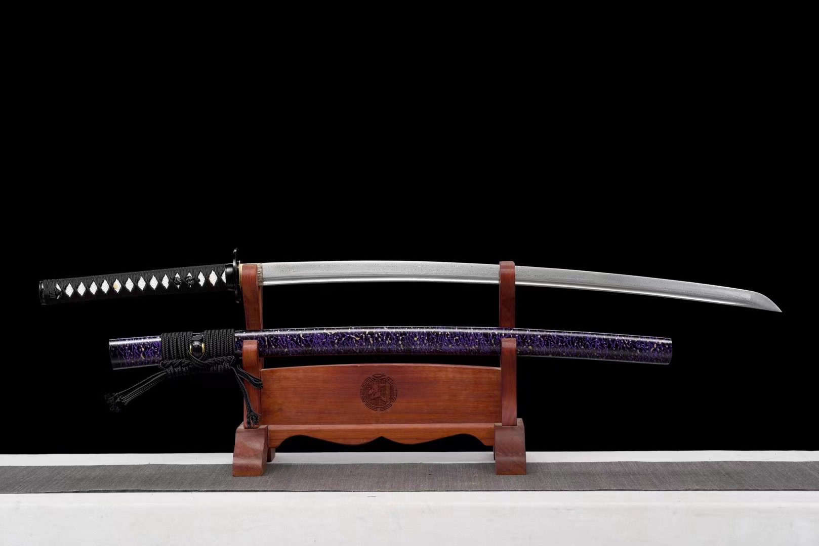 - Fodero (Saya 鞘): realizzato in legno laccato viola e nero con estremità nere (Kojiri e Koiguchi).
