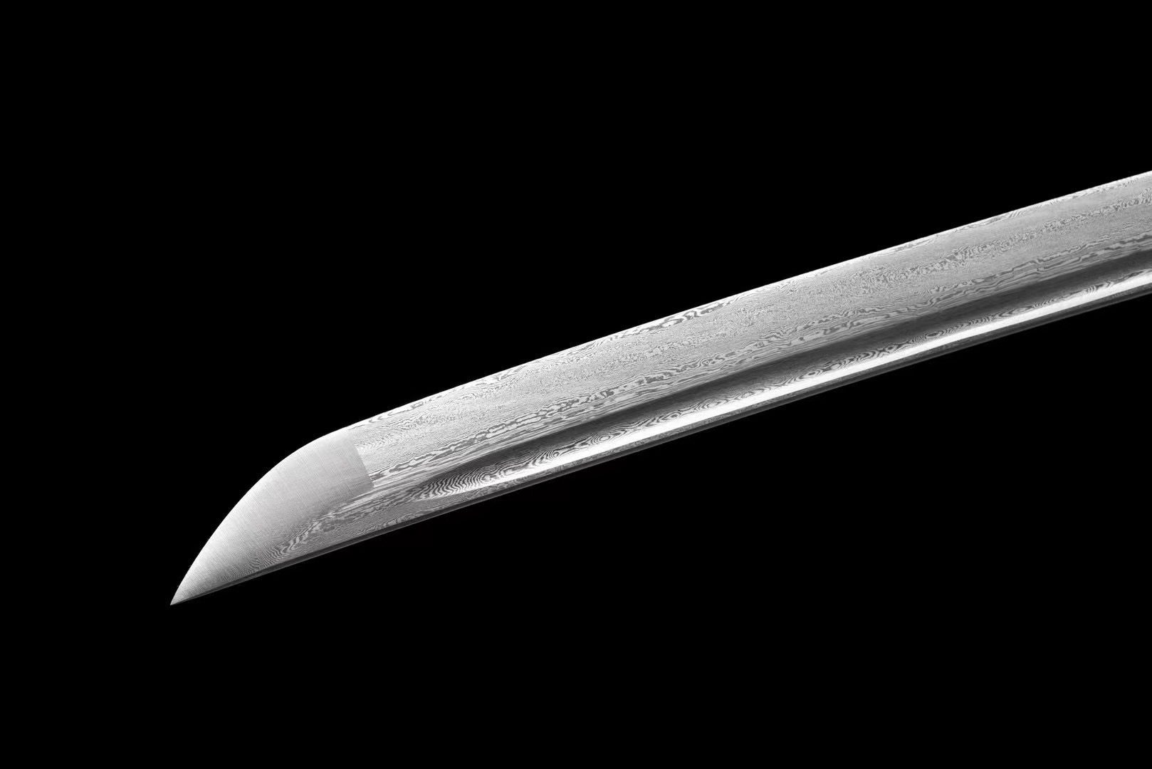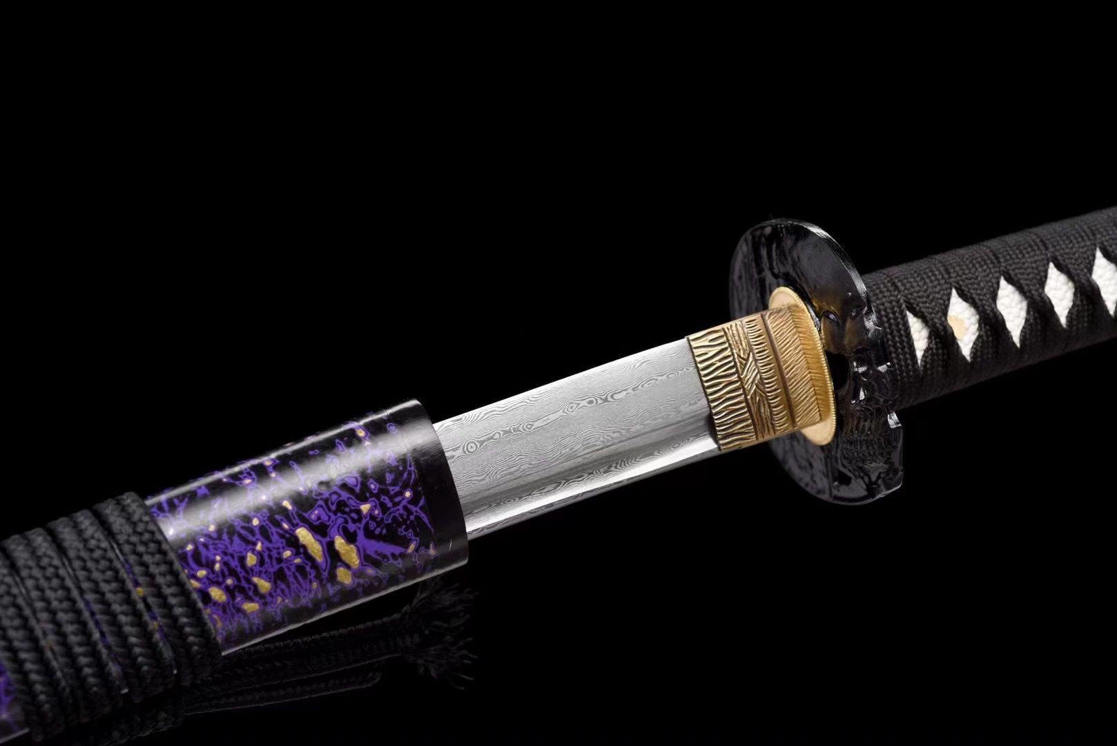 La sua lama in acciaio Damasco rivela motivi ondulati che ricordano il fumo che si alza da un campo di battaglia, mentre il bo-hi alleggerisce la struttura e produce un caratteristico sibilo quando viene mosso. La guardia (tsuba) in lega nera a forma di teschio è l’elemento centrale di questa katana, un costante richiamo alla fragilità dell’esistenza. L’impugnatura (tsuka) combina pelle di razza bianca e legno, creando un suggestivo contrasto con l’intreccio nero a rombi (tsuka-ito). I menuki raffiguranti un drago nero simboleggiano la forza spirituale che trascende la morte, mentre gli elementi fuchi e kashira in lega nera liscia ampliano l’estetica oscura. Il fodero (saya) in legno laccato viola e nero evoca i colori del lutto e della nobiltà, completato da un sageo nero e da estremità nere che unificano il tutto.