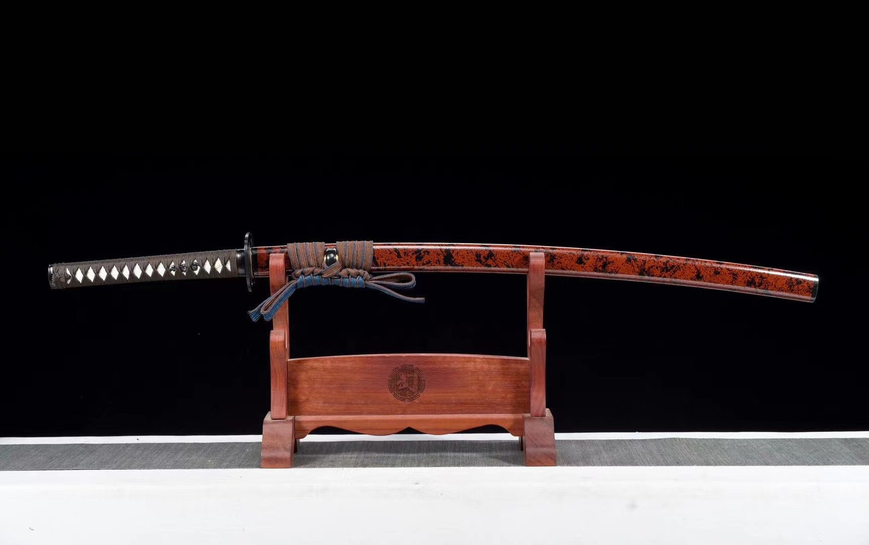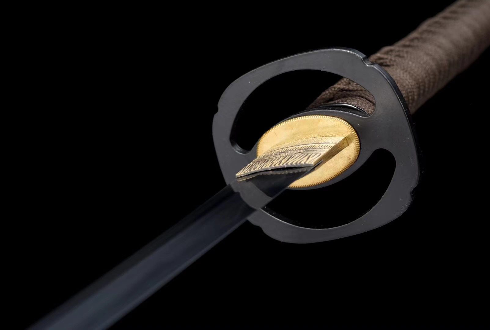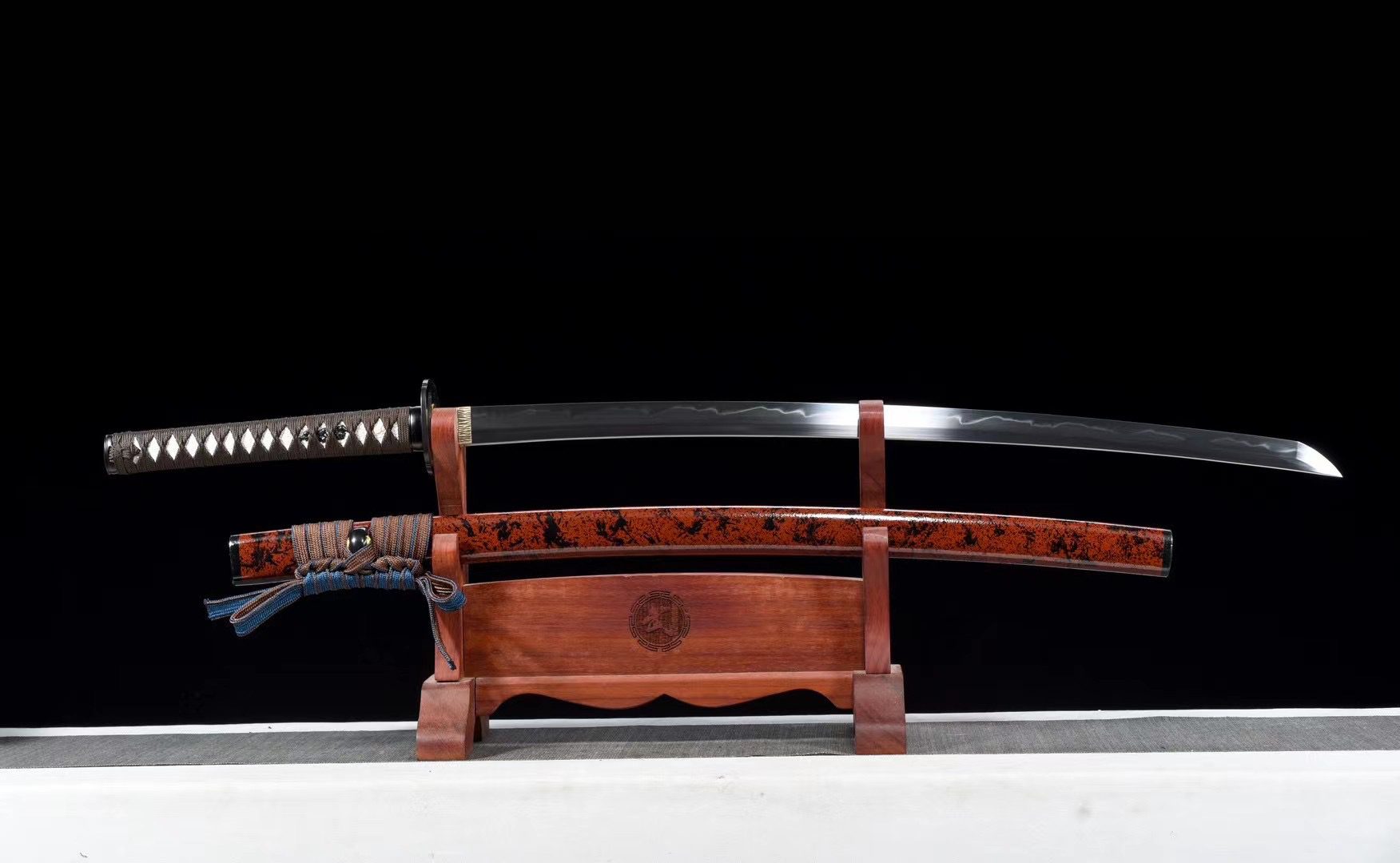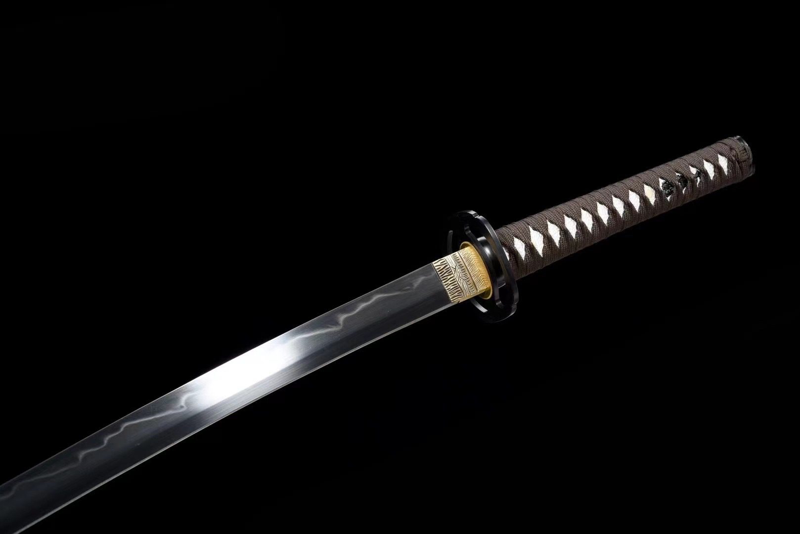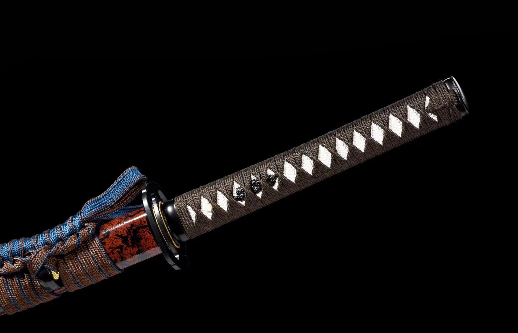 - Tsuka-ITO (柄糸): marrone intrecciato sopra l’impugnatura con motivo a rombi.