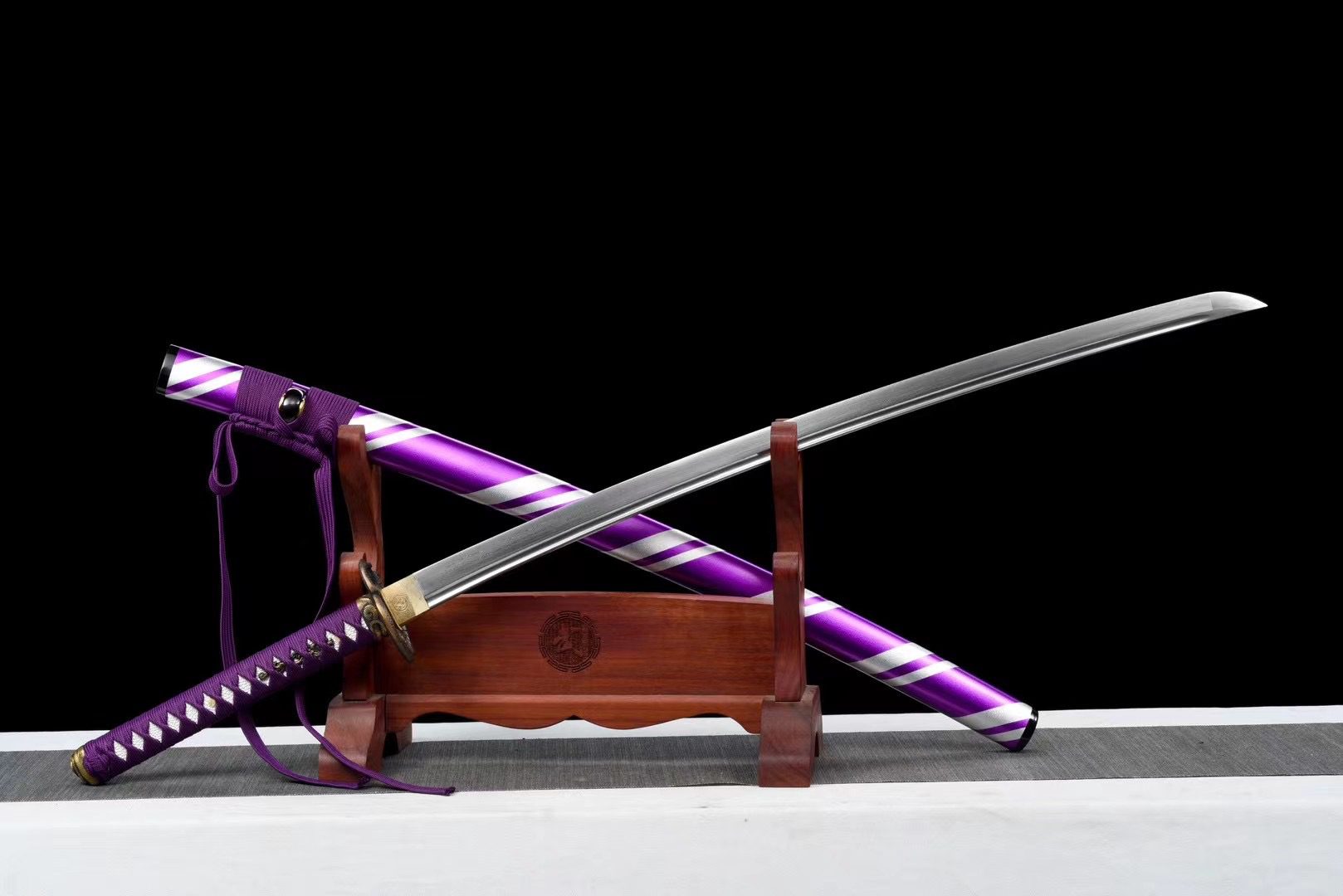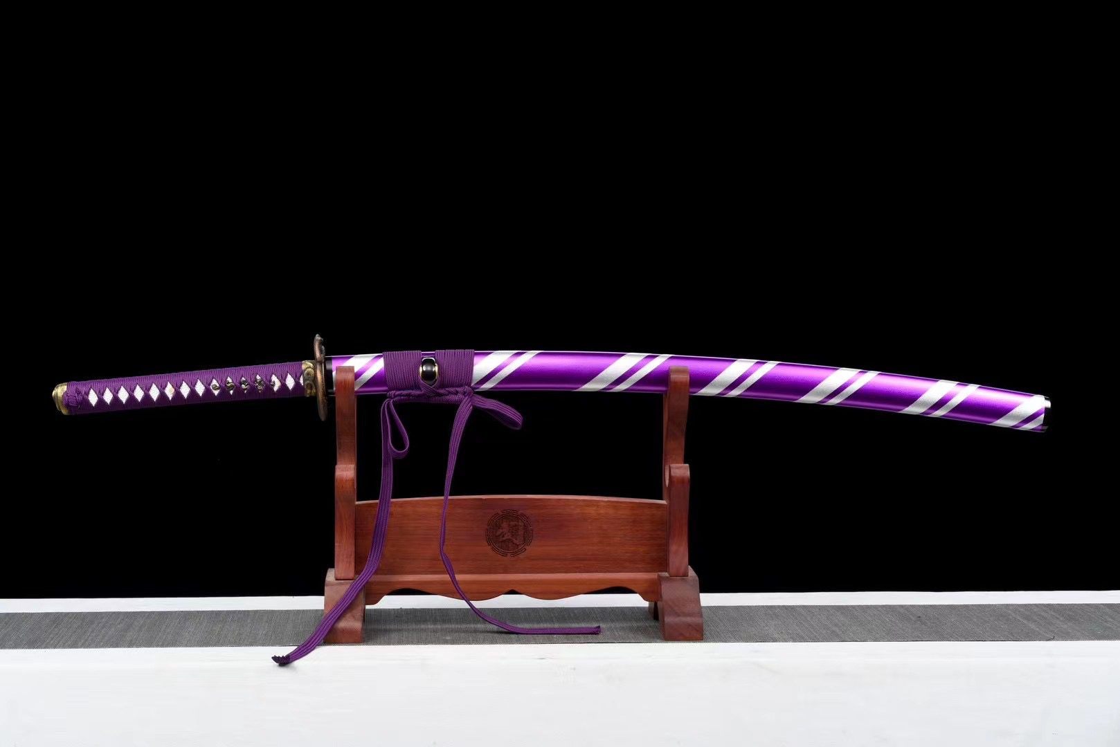 - Fodero (Saya 鞘): legno laccato con linee alternate bianche e viola, con Kojiri e Koiguchi neri.