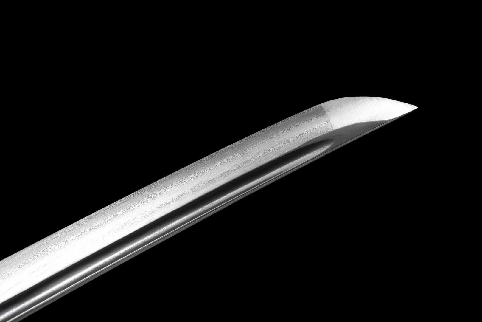 La lama in acciaio Damasco rivela motivi ondulati che ricordano le squame di serpente, mentre il bo-hi alleggerisce l’effetto complessivo e produce un caratteristico sibilo quando la spada viene mossa. La tsuba color rame presenta un serpente arrotolato, un motivo che si ripete sul fuchi e sul kashira. L’impugnatura combina la texture ruvida del samegawa bianco con una treccia viola a forma di diamante, offrendo una presa salda ed elegante. I menuki raffigurano un drago nero. Il fodero laccato alterna sottilmente linee bianche e viola, in contrasto con le estremità nere, mentre il sageo viola completa l’insieme.