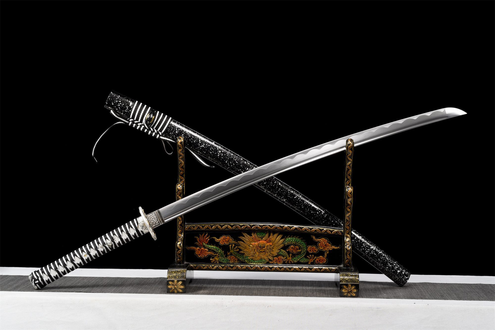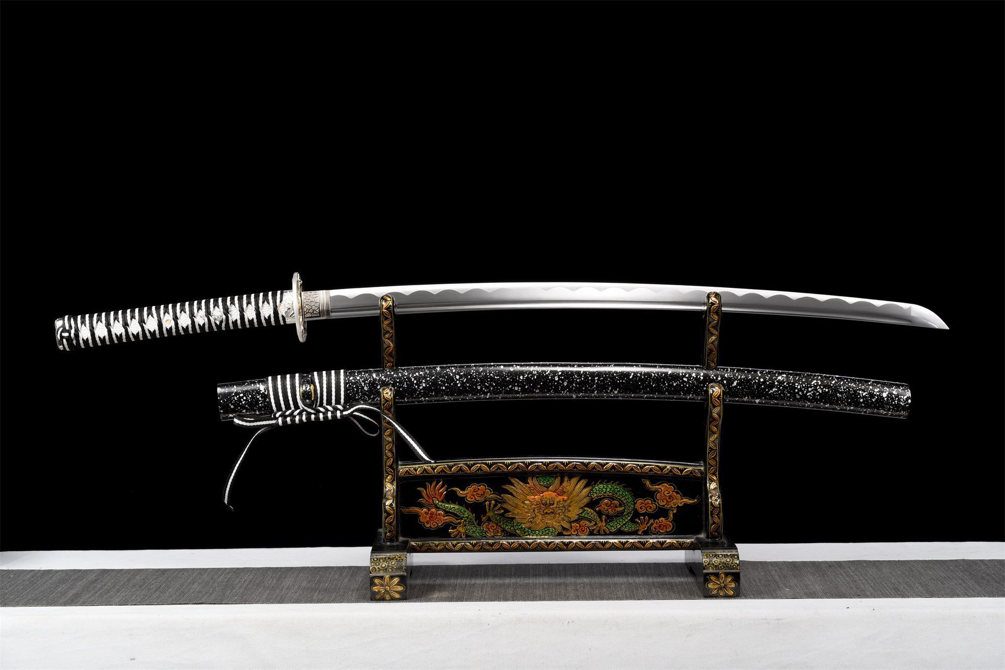 - Fodero (Saya 鞘): legno laccato nero con gocce d’acqua argentate.