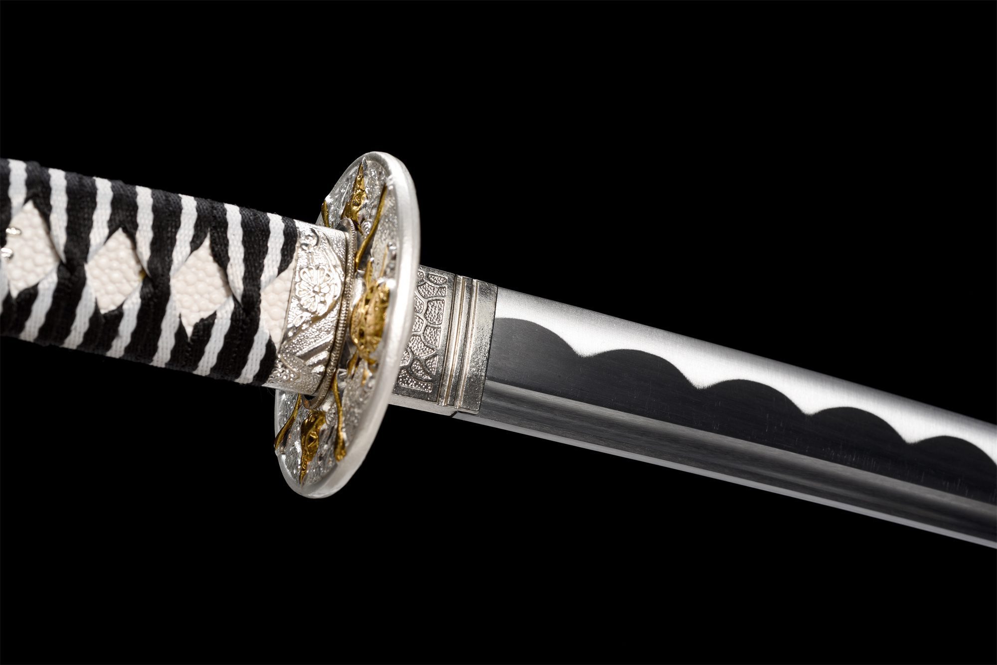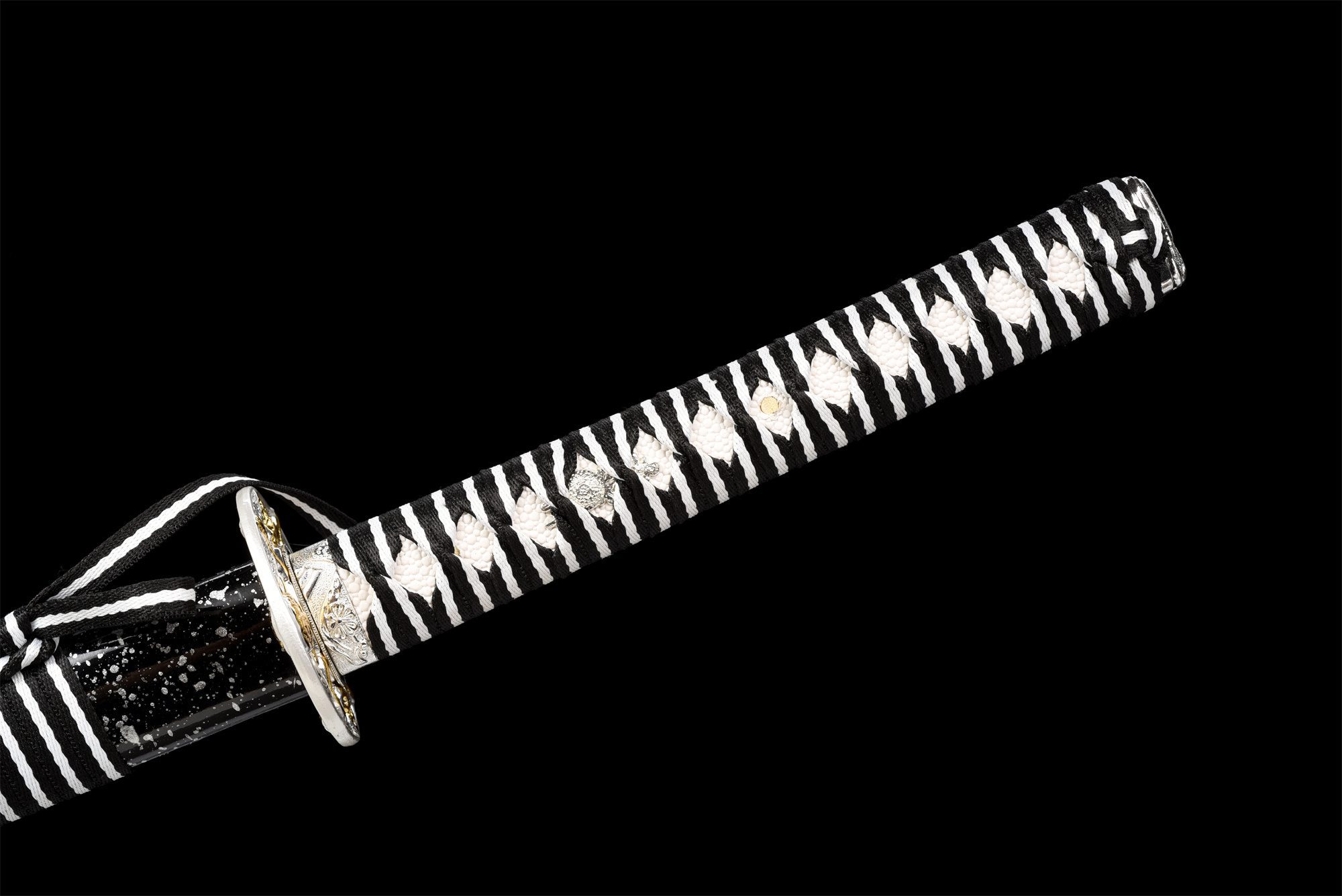 - Tsuka-ITO (柄糸): intrecciato in bianco e nero sopra l’impugnatura con motivo a rombi.