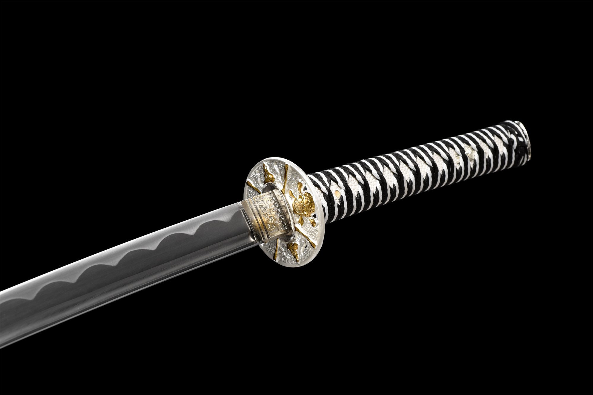 La sua lama in acciaio 1060 presenta una finitura nero intenso che ricorda le notti senza luna in cui i pirati solcavano i mari, mentre il genuino hamon notare ottenuto attraverso la tempra differenziale crea onde argentee lungo il filo della lama. Il bo-hi scava la lama per alleggerirne il peso complessivo, producendo un caratteristico sibilo quando viene mossa. La tsuba argentata arrotondata è decorata con teschi dorati, simbolo iconico della pirateria, incorniciati da fuchi e kashira argentati con raffinati motivi floreali. L’impugnatura combina la tradizionale pelle di razza bianca sintetica con una treccia tsuka-ito a rombi bianchi e neri, creando un contrasto sorprendente esaltato dai menuki in argento. Il fodero in legno laccato nero è decorato con gocce d’acqua in argento che evocano gli spruzzi del mare, completato da un sageo bianco e nero.