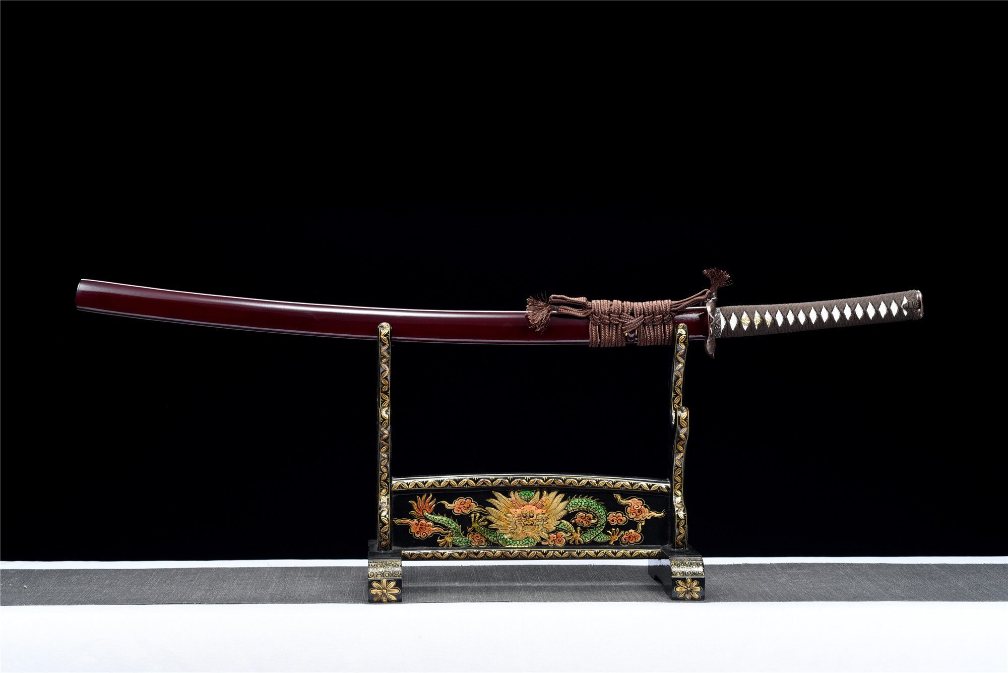 - Fodero (Saya 鞘): legno laccato rosso.