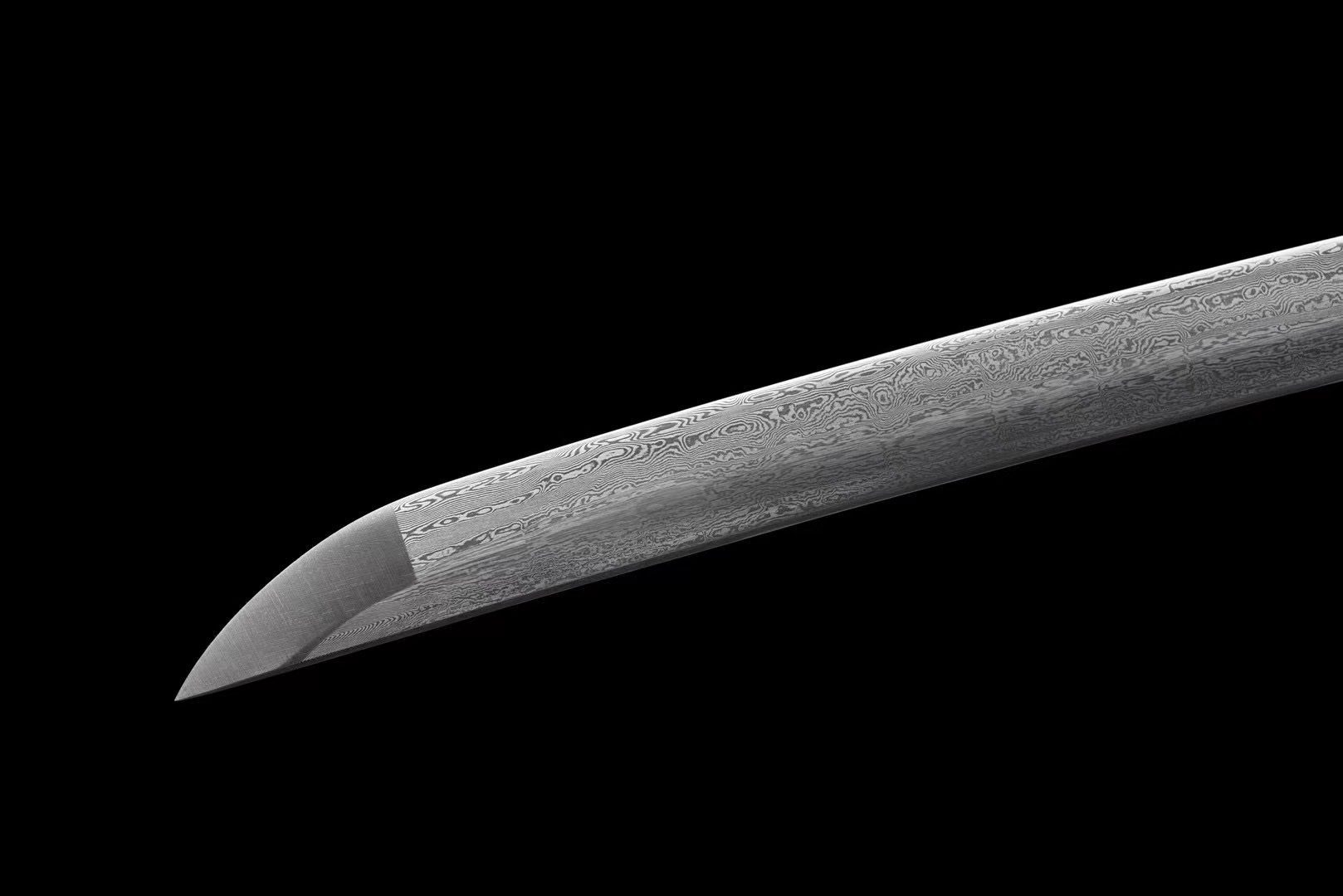 La sua lama in acciaio di Damasco rivela i caratteristici motivi ondulati di questo metallo eccezionale, creando sottili riflessi che danzano sulla superficie levigata. Questa antica tecnica di forgiatura conferisce alla lama una bellezza unica, garantendone al contempo la resistenza. La tsuba rotonda in lega nera si distingue per la sua rappresentazione artistica di una testa di samurai, un costante richiamo al patrimonio guerriero di quest’arma. L’impugnatura (tsuka) combina armoniosamente la tradizionale pelle di razza bianca (samegawa) con una treccia nera (tsuka-ito) a forma di rombo, offrendo una presa salda ed elegante. I menuki rappresentano draghi neri, simboli di potere e protezione nella cultura giapponese. Il fodero a strisce nere (saya) rivela riflessi blu e dorati che catturano la luce, creando un suggestivo contrasto con le estremità nere del kojiri e del koiguchi. Il sageo nero completa questo insieme con sobrietà.
