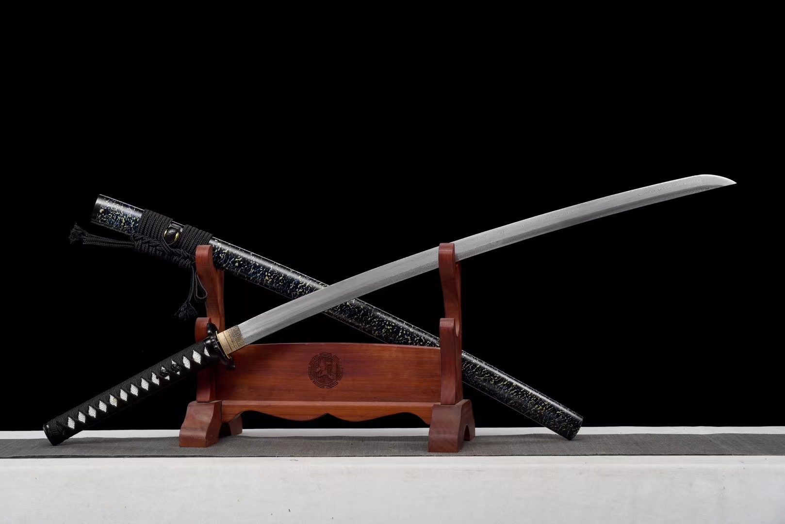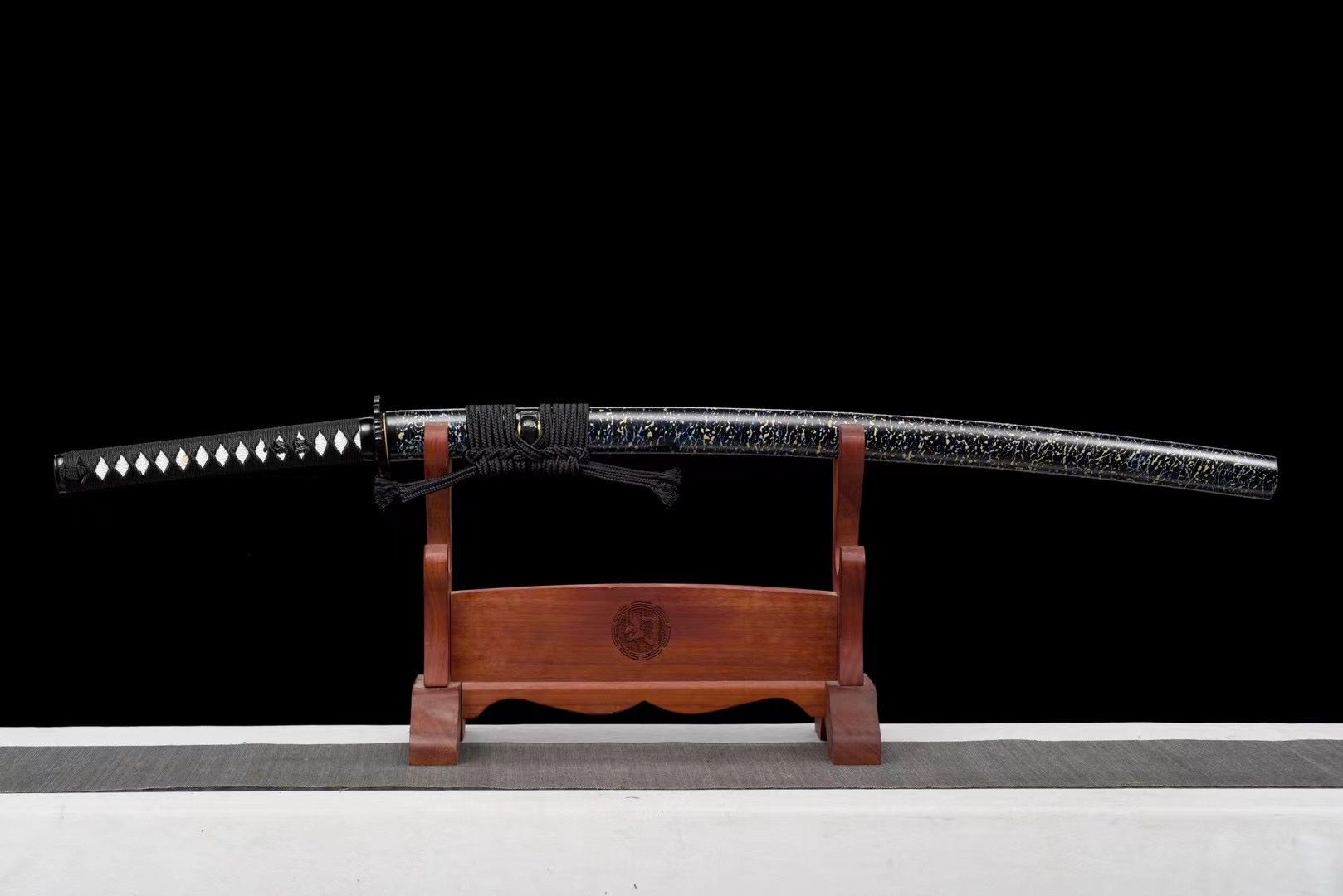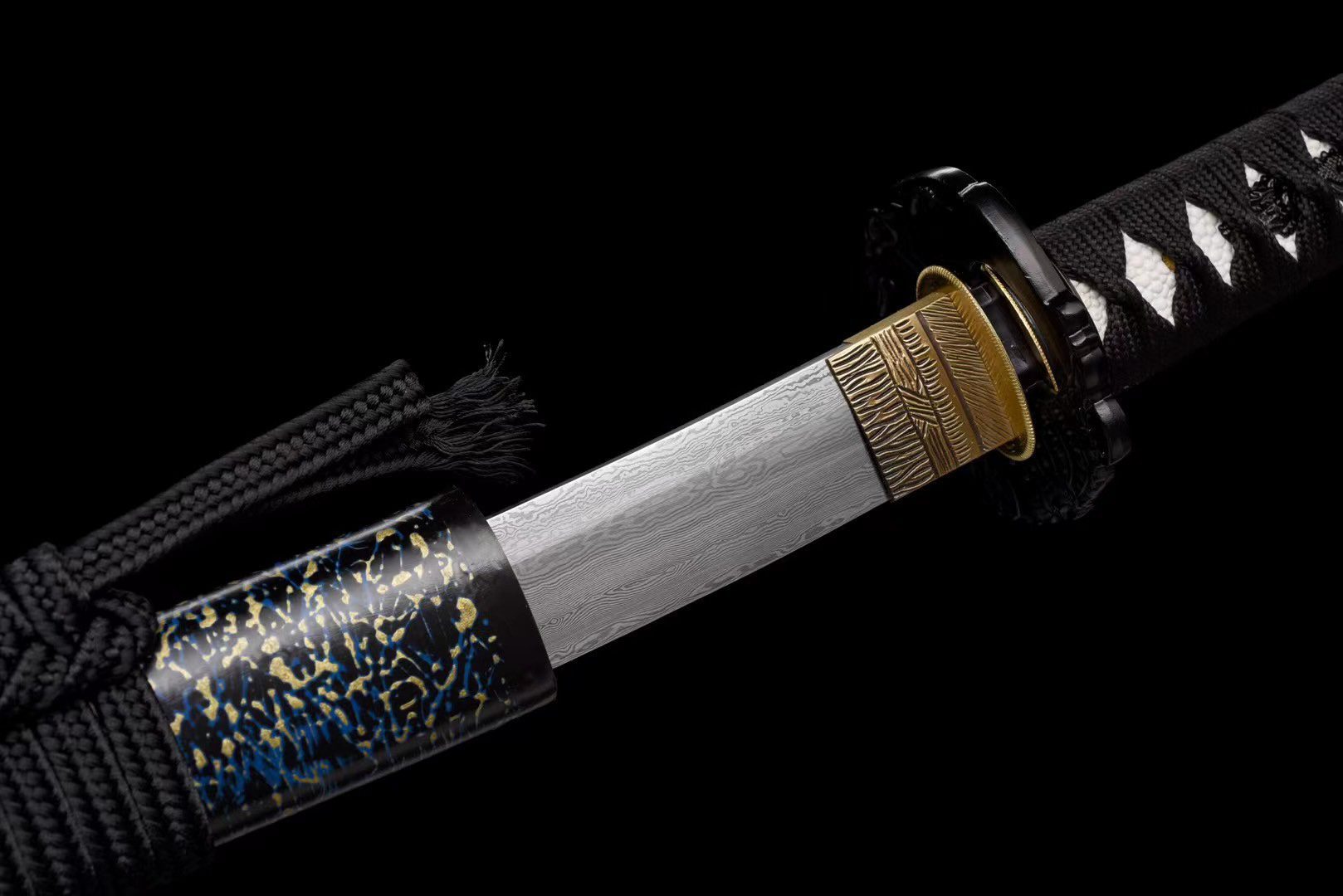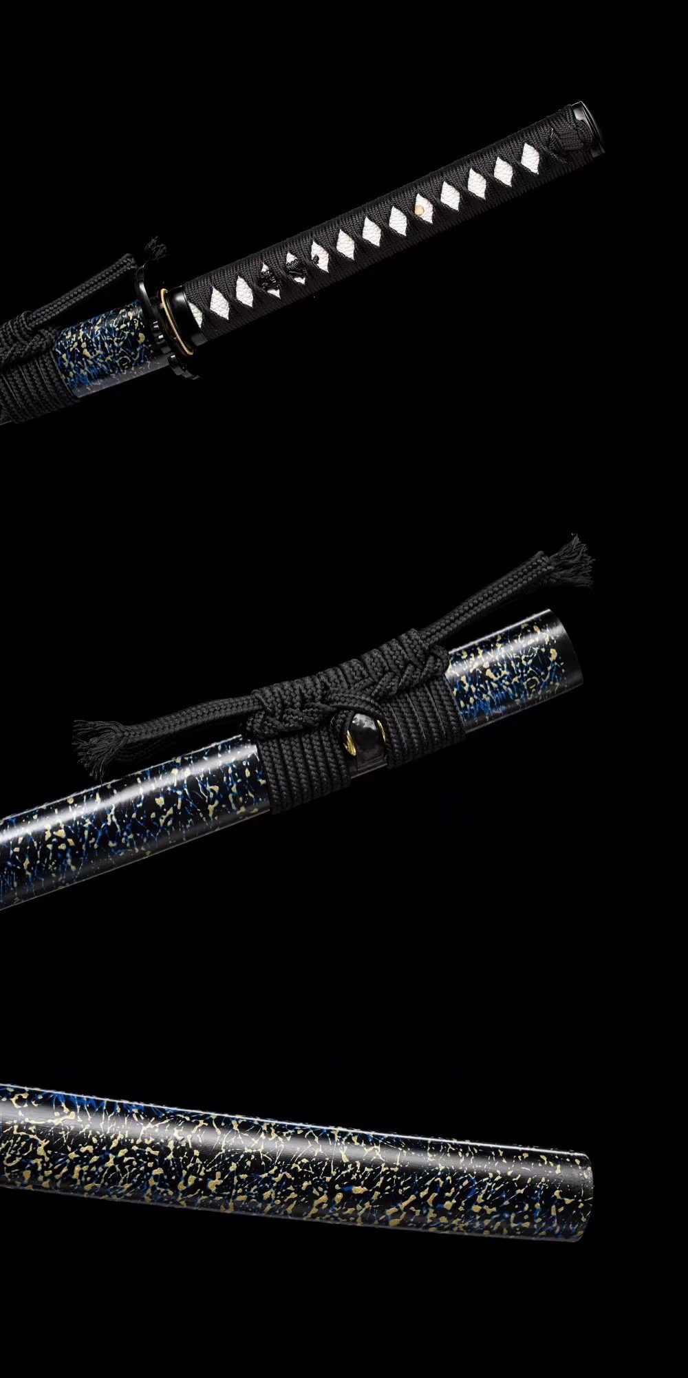 - Fodero (Saya 鞘): realizzato in legno laccato nero con rifiniture blu e oro, estremità nere (Kojiri e Koiguchi).