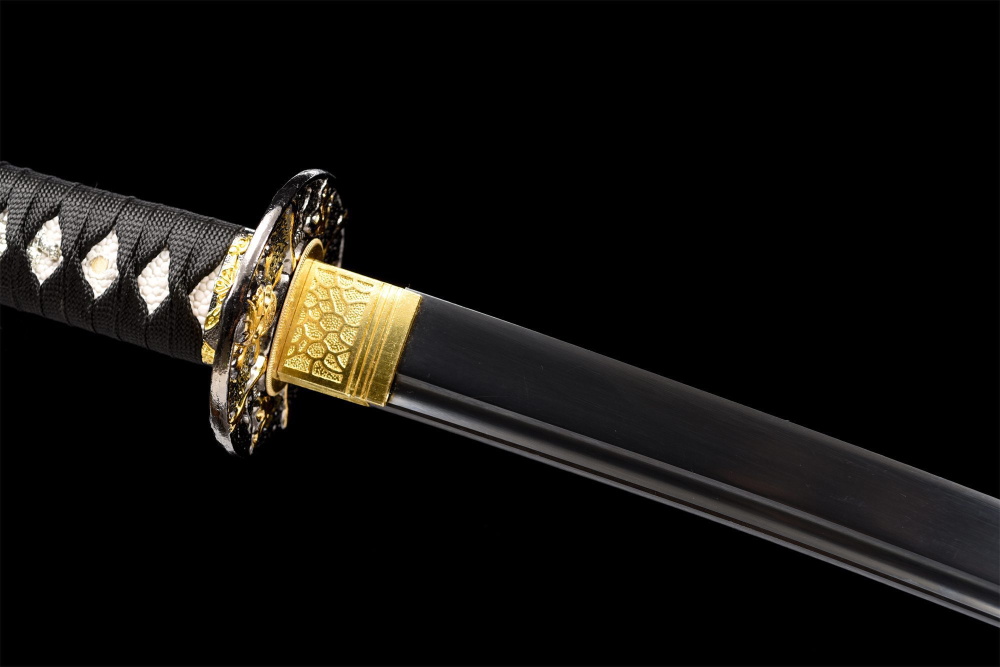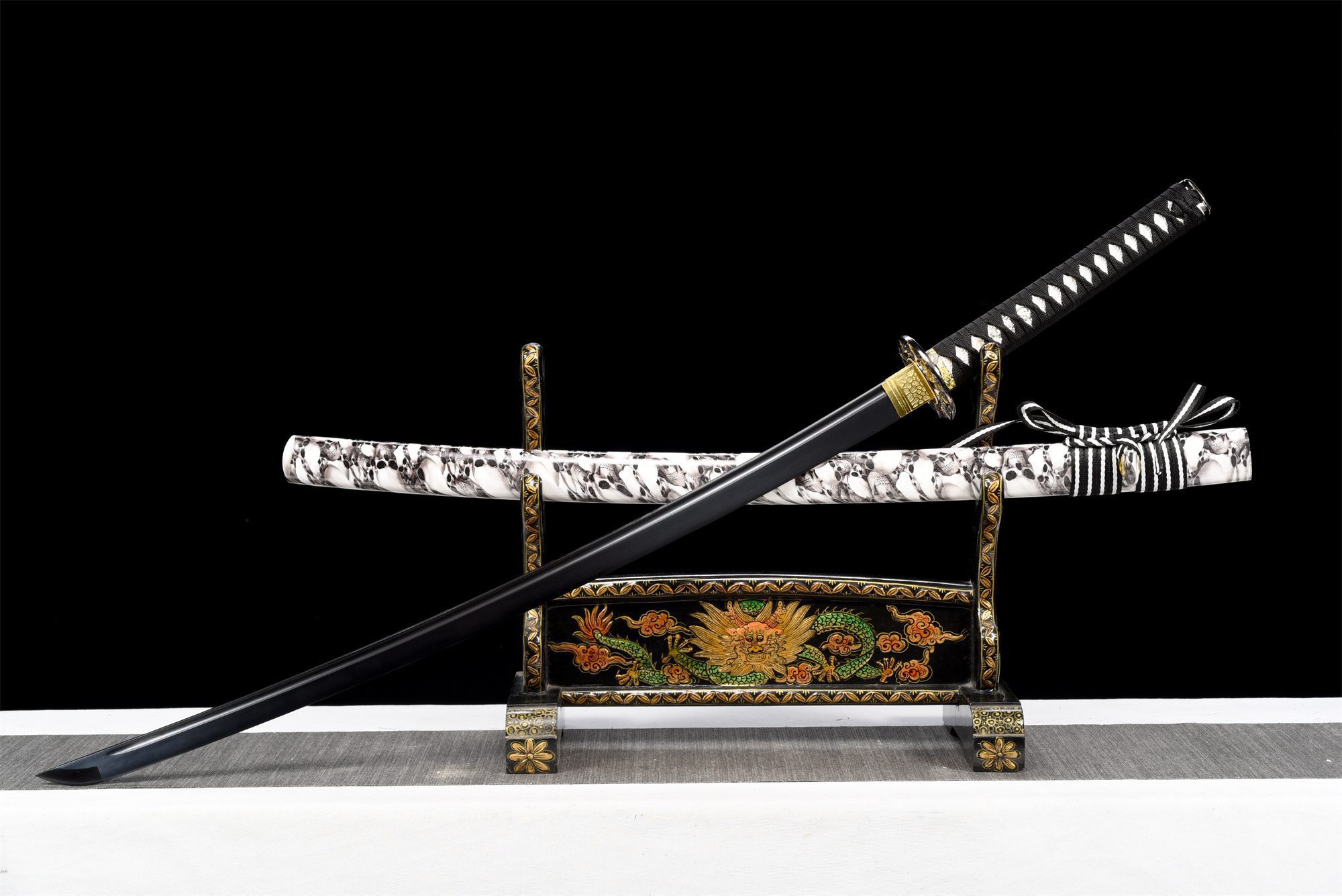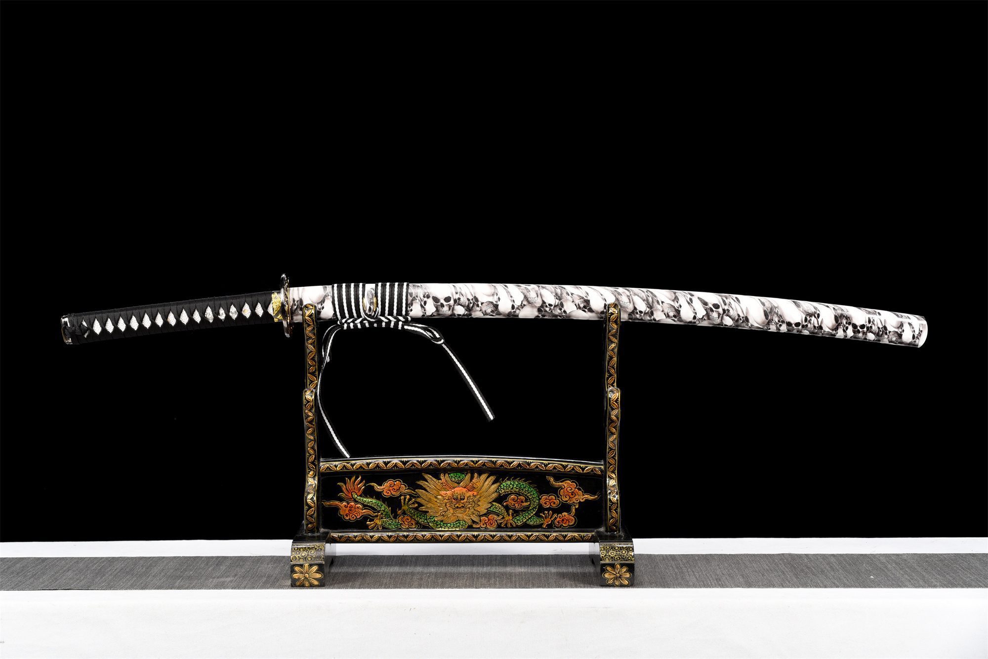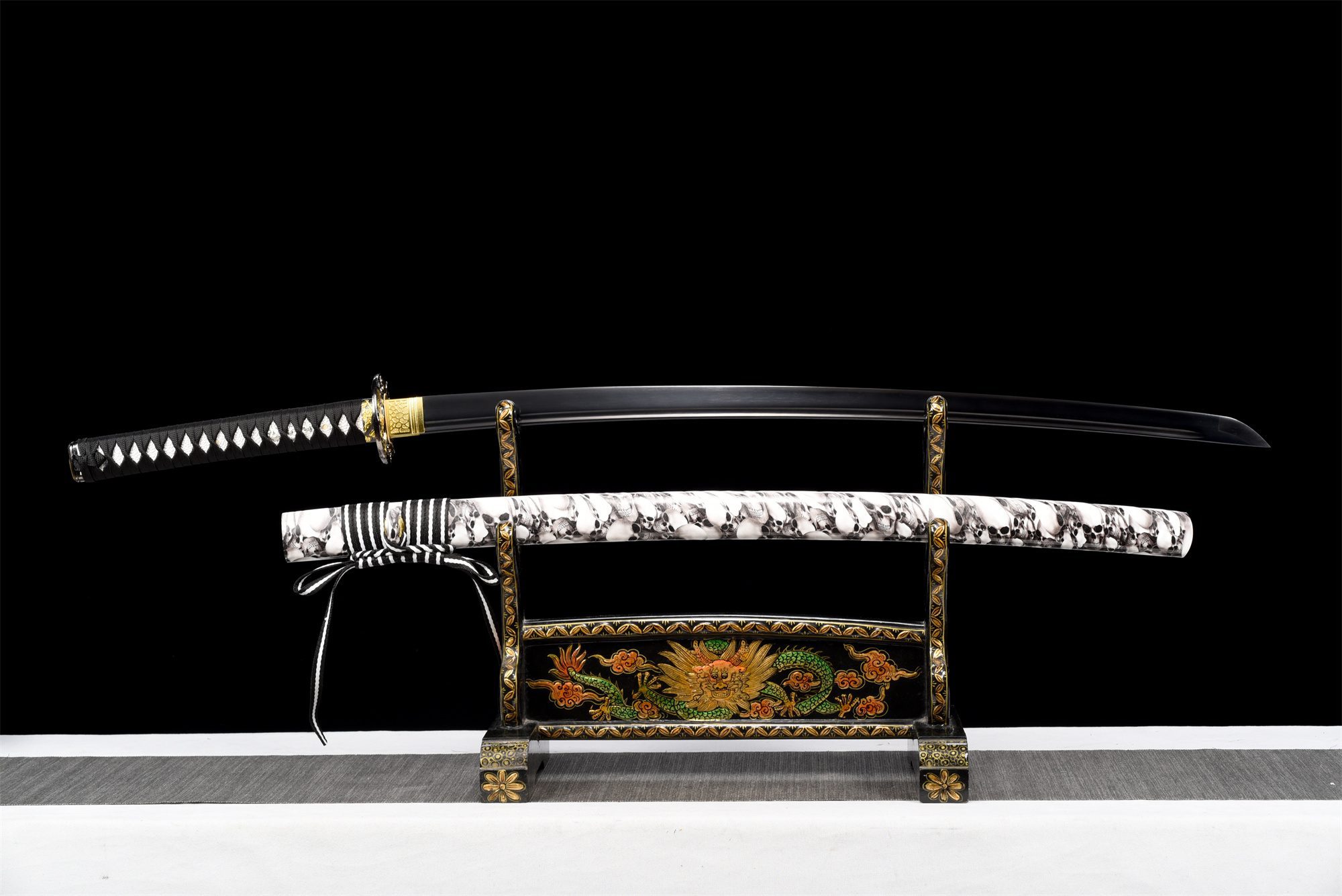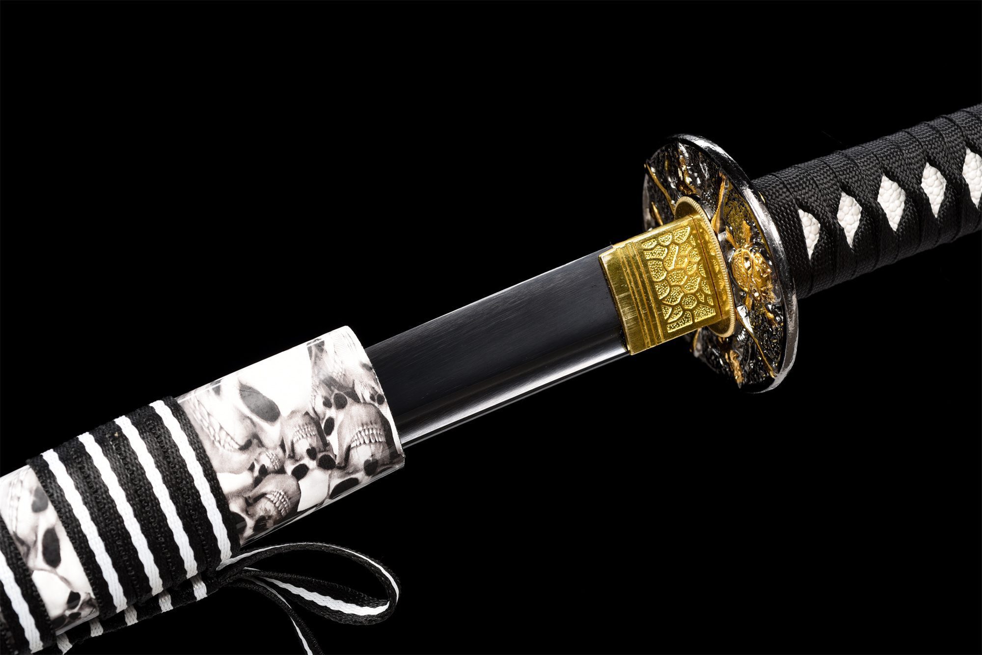 - Fodero (Saya 鞘): legno laccato nero decorato con teschi bianchi.