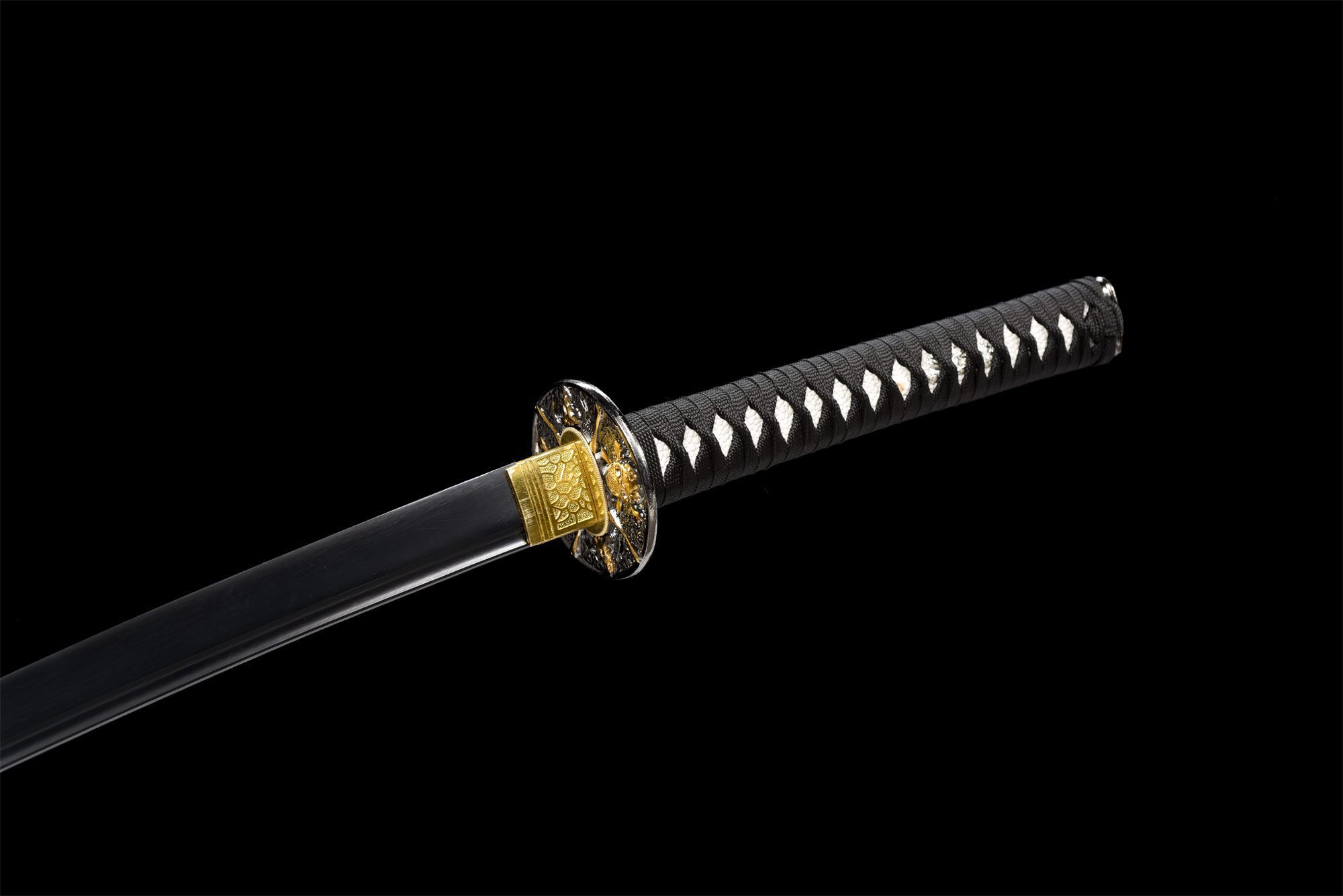 La sua lama in acciaio 1060 presenta una finitura nero intenso che assorbe la luce e conferisce all’arma un’aura misteriosa. Il bo-hi intagliato nell’acciaio alleggerisce la struttura e produce un caratteristico sibilo quando viene mosso. La tsuba rotonda in lega nera si distingue per il teschio dorato al centro, simbolo universale della mortalità. L’impugnatura combina armoniosamente finta pelle di razza bianca e intrecci neri a forma di diamante, creando un contrasto sorprendente esaltato dai menuki argentati. Il fodero in legno laccato nero rivela teschi bianchi che emergono dall’oscurità, mentre il sageo bicolore bianco e nero simboleggia l’equilibrio tra luce e oscurità.