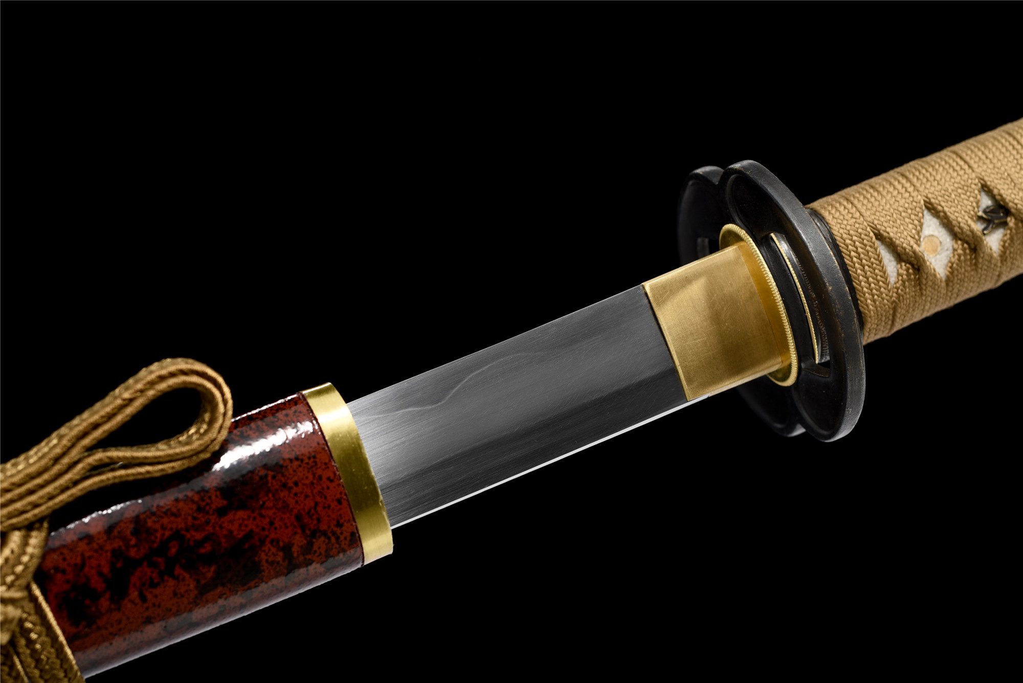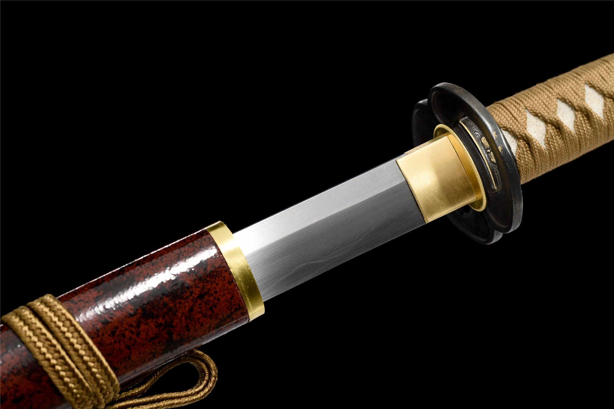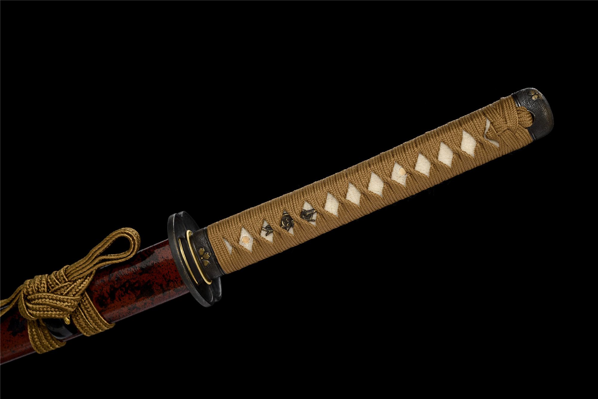 - Tsuka-ITO (柄糸): marrone dorato intrecciato sopra l’impugnatura.