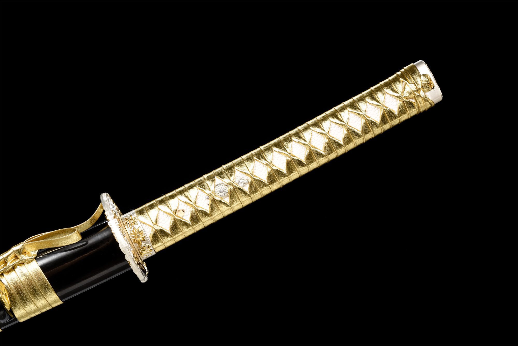 La sua lama in acciaio 1060 presenta una finitura nero intenso che contrasta magnificamente con gli accenti dorati, mentre il hamon notare autentico ottenuto attraverso la tempra differenziale crea motivi ondulati lungo il bordo. Il bo-hi incava elegantemente la lama, riducendone il peso e preservandone l’integrità strutturale. La tsuba arrotondata in lega bianca e dorata presenta delicati motivi floreali che si ripetono armoniosamente sul fuchi e sul kashira, creando una notevole coerenza estetica. L’impugnatura combina finta pelle di razza bianca con intrecci in pelle dorata a rombi, garantendo una presa sicura e un aspetto lussuoso. Il fodero in legno laccato nero e oro completa questo raffinato insieme, impreziosito da un sageo dorato che aggiunge un tocco finale di eleganza.