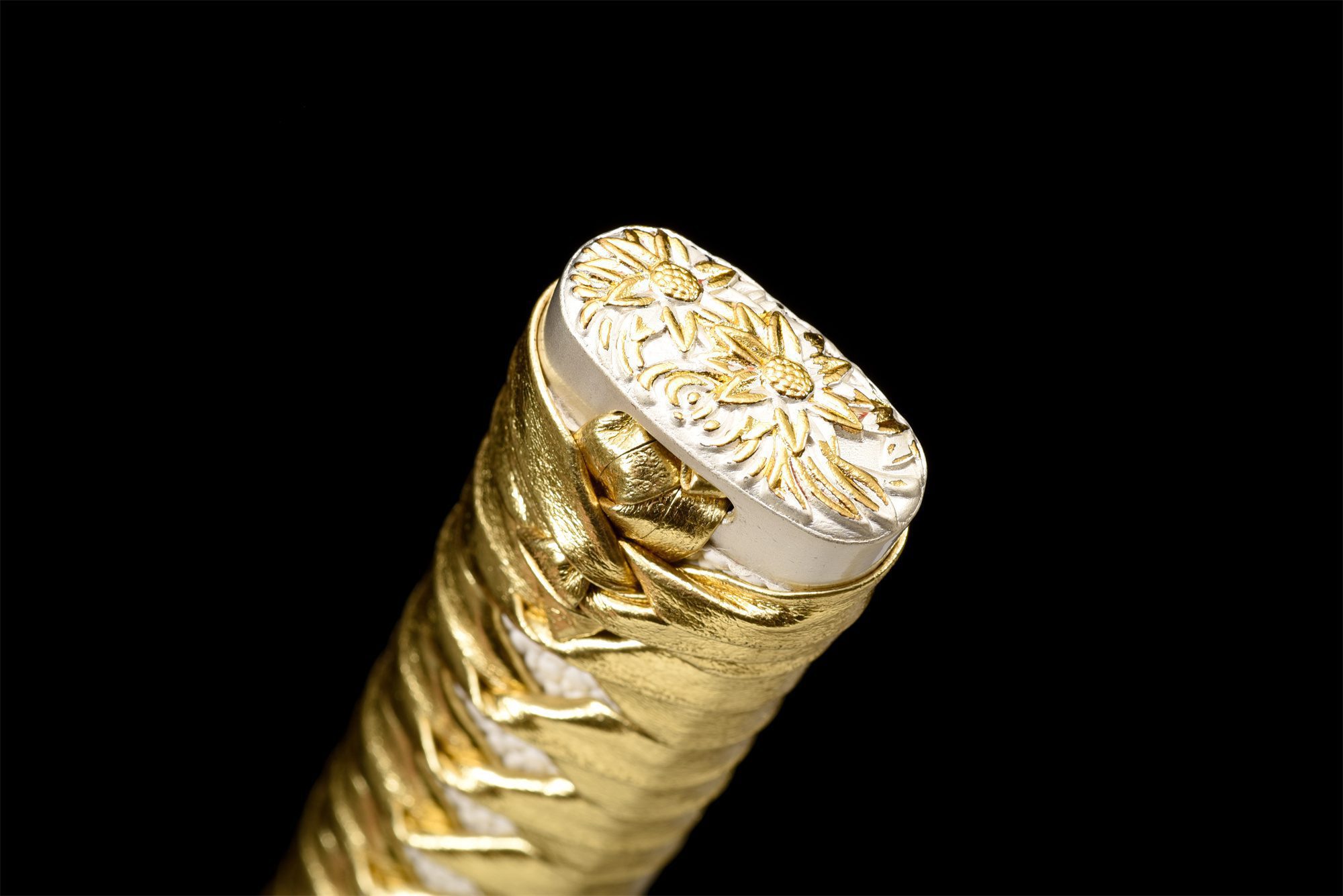 - Kashira (頭): lega bianca e oro con motivi floreali.