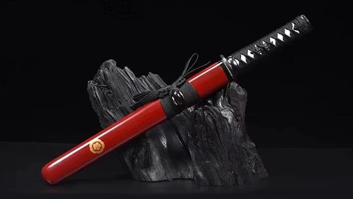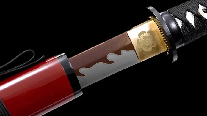 - Saya (鞘): fodero in legno laccato rosso decorato con il simbolo del crisantemo dipinto.