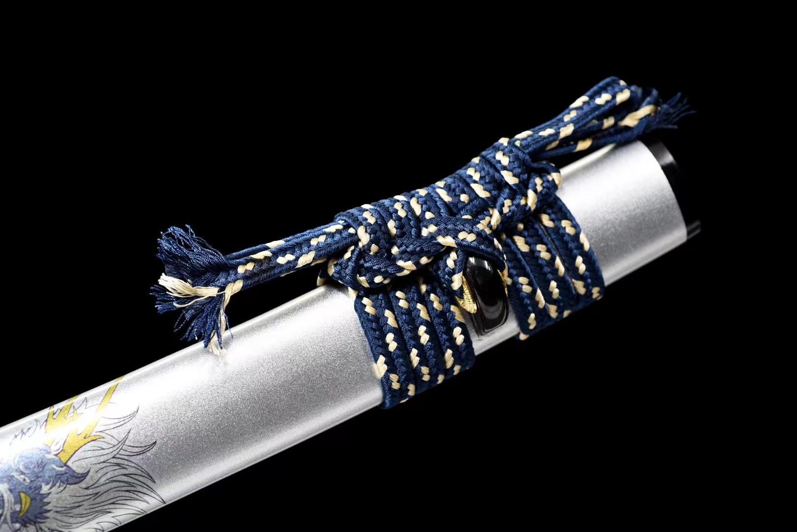 - Fodero (Saya 鞘): fodero in legno laccato grigio decorato con un drago blu e giallo, kojiri e koiguchi neri.