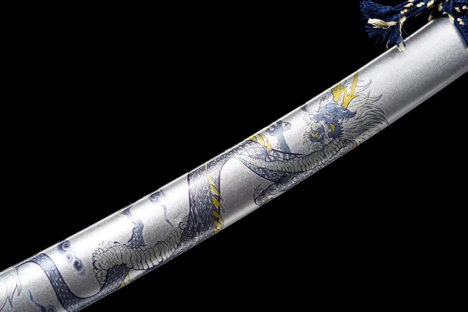 La lama in acciaio T10 rivela un autentico gunome hamon, risultato di una tempra differenziale che crea onde irregolari lungo il filo del taglio. Il bo-hi intagliato nell’acciaio alleggerisce la lama e produce un caratteristico sibilo quando viene mossa. La tsuba rotonda presenta un suggestivo contrasto tra il bianco e il nero, esaltato da delicate dorature che evocano l’equilibrio delle forze opposte. L’impugnatura, ricoperta di samegawa bianco e intrecciata con tsuka-ito immacolato in un motivo a rombi, presenta menuki che rappresentano draghi dorati. Il fuchi e il kashira in lega bianca adornati con fiori dorati completano questa armonia cromatica, mentre il fodero laccato grigio è decorato con un drago blu e giallo che sembra prendere vita sulla sua superficie lucida.